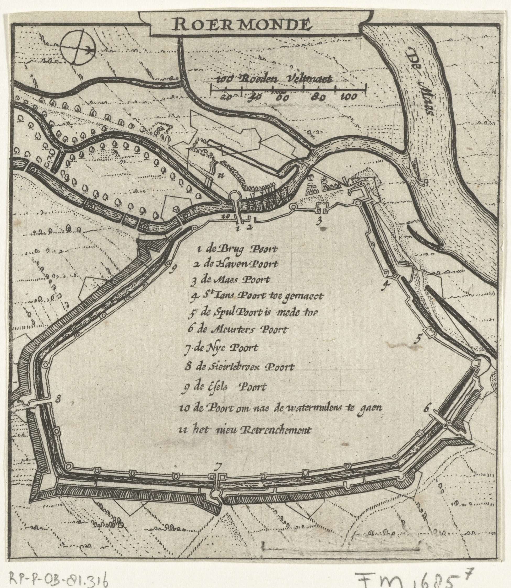 Plattegrond van Roermond. Met legenda 1-11. Onderdeel van een groep plattegronden van steden, forten en dijken in Brabant veroverd door het Staatse leger onder Frederik Hendrik in de jaren 1631-1632.