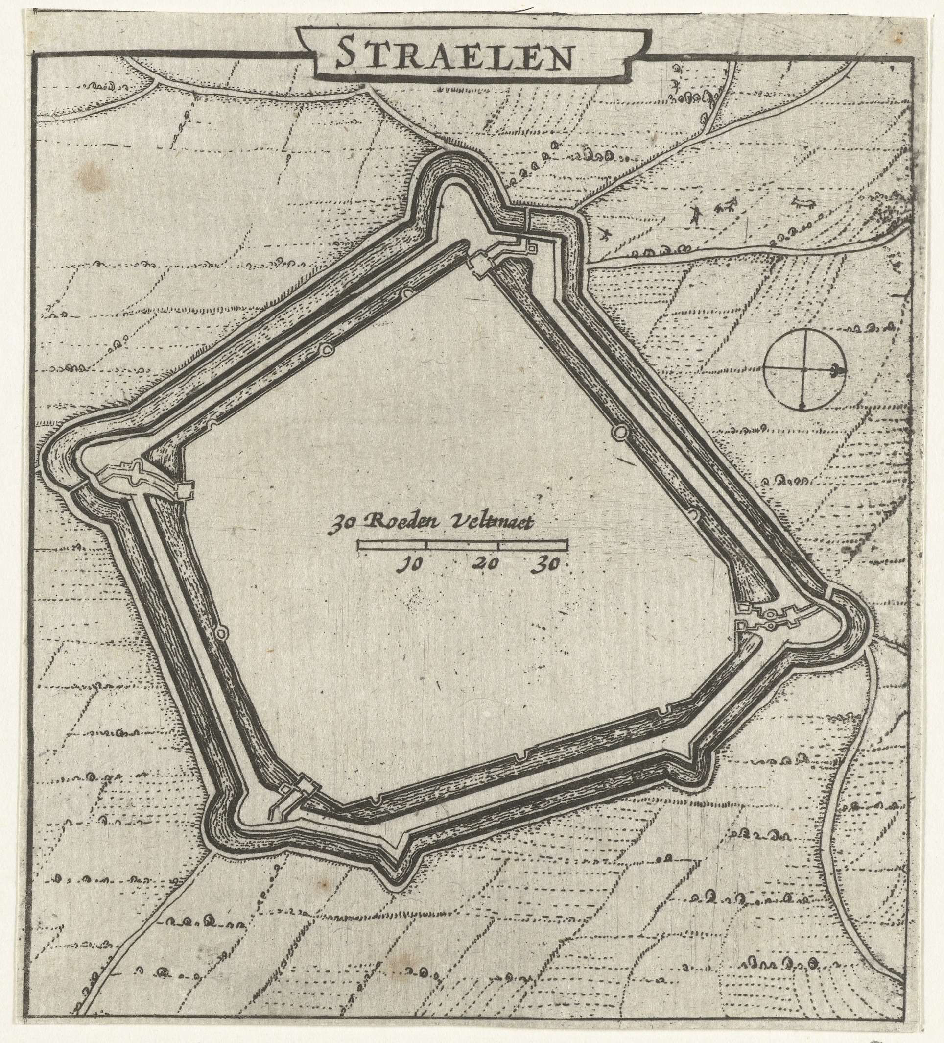 Plattegrond van Straelen. Onderdeel van een groep plattegronden van steden, forten en dijken in Brabant veroverd door het Staatse leger onder Frederik Hendrik in de jaren 1631-1632.