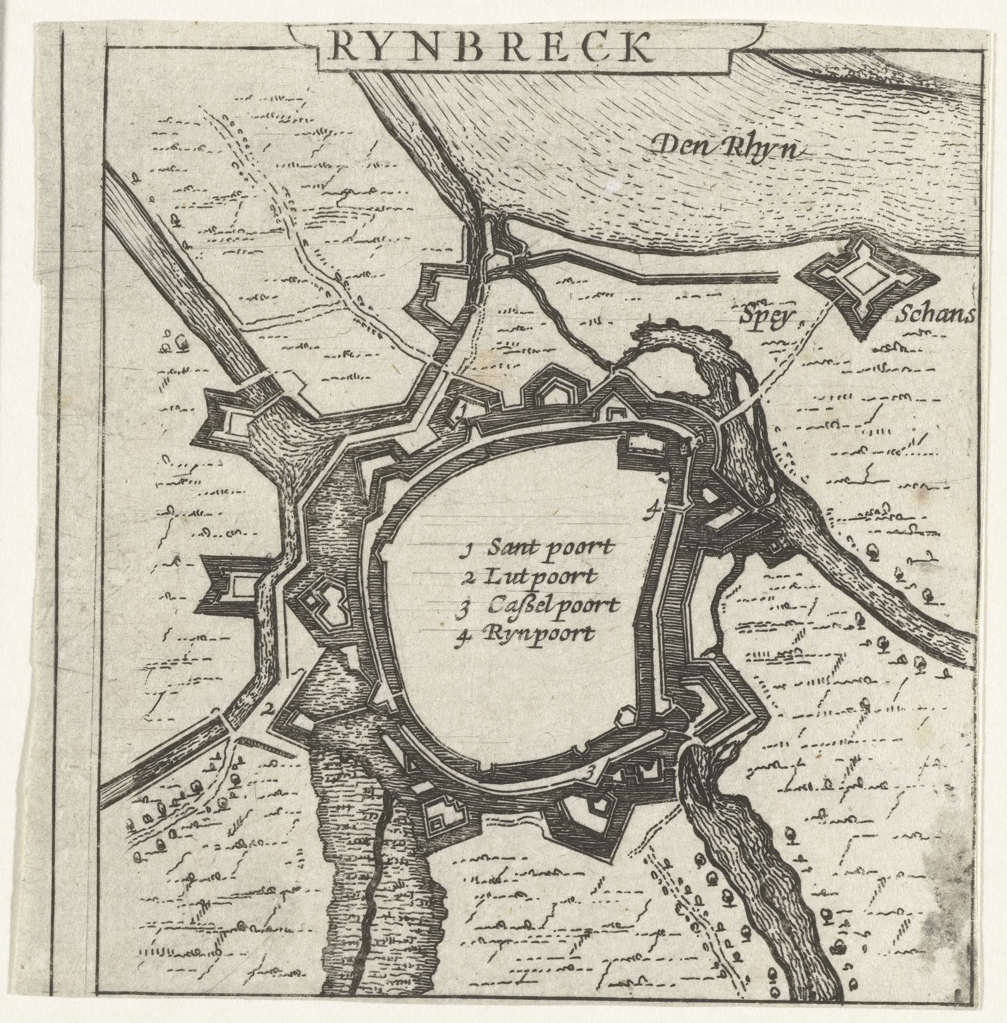 Plattegrond van Rijnberg. Met de legenda 1-4. Onderdeel van een groep plattegronden van steden, forten en dijken in Brabant veroverd door het Staatse leger onder Frederik Hendrik in de jaren 1631-1632.