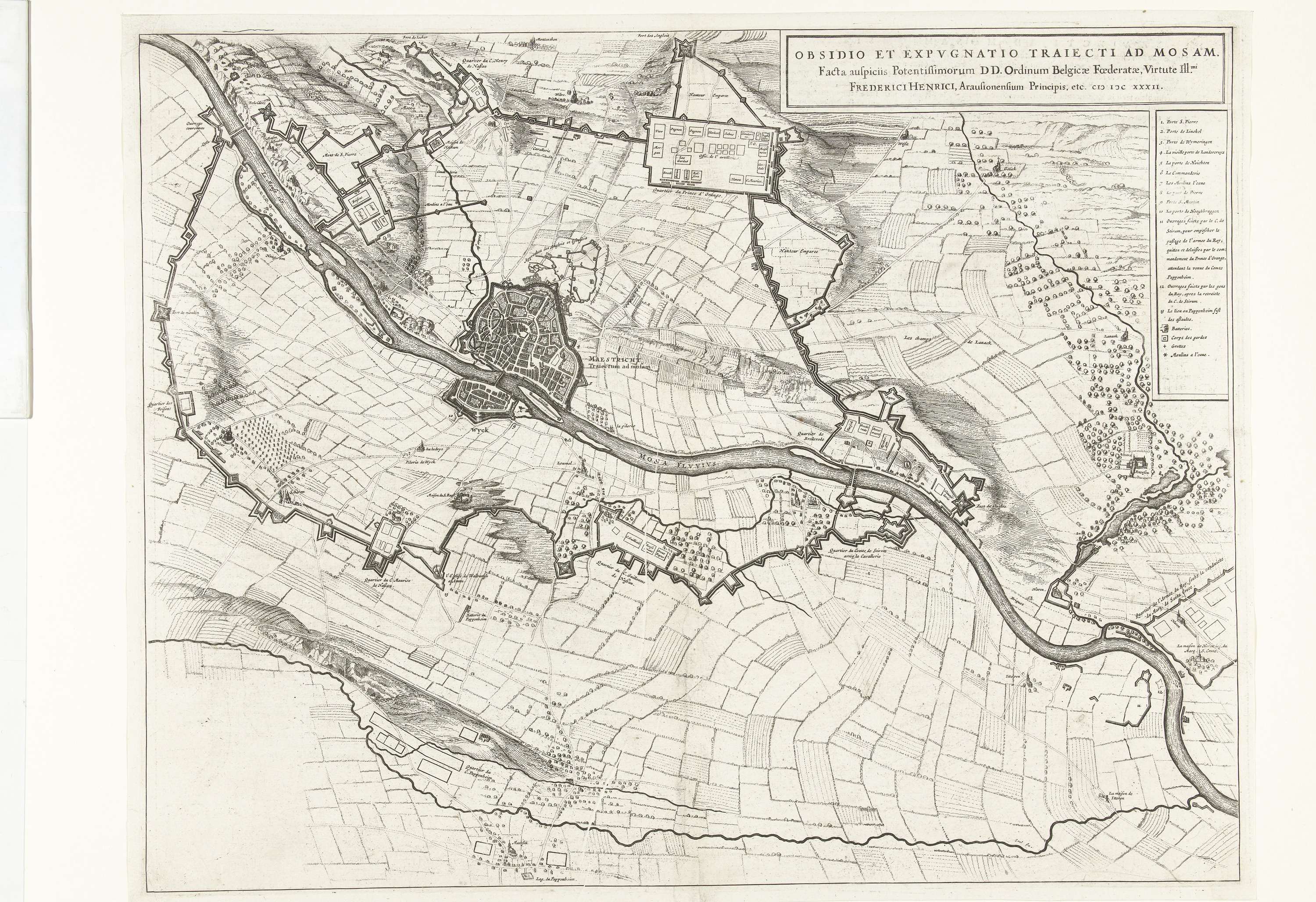Kaart van het beleg van Maastricht door het Staatse leger onder stadhouder Frederik Hendrik, 9 juni tot 21 augustus 1632. Met de verschillende legerkampen van de belegeraars. Rechts de legenda 1-13. Op een dubbelblad genomen uit het Stedenboek van Blaeu, bedrukt op achterzijde met tekst in het Latijn.
