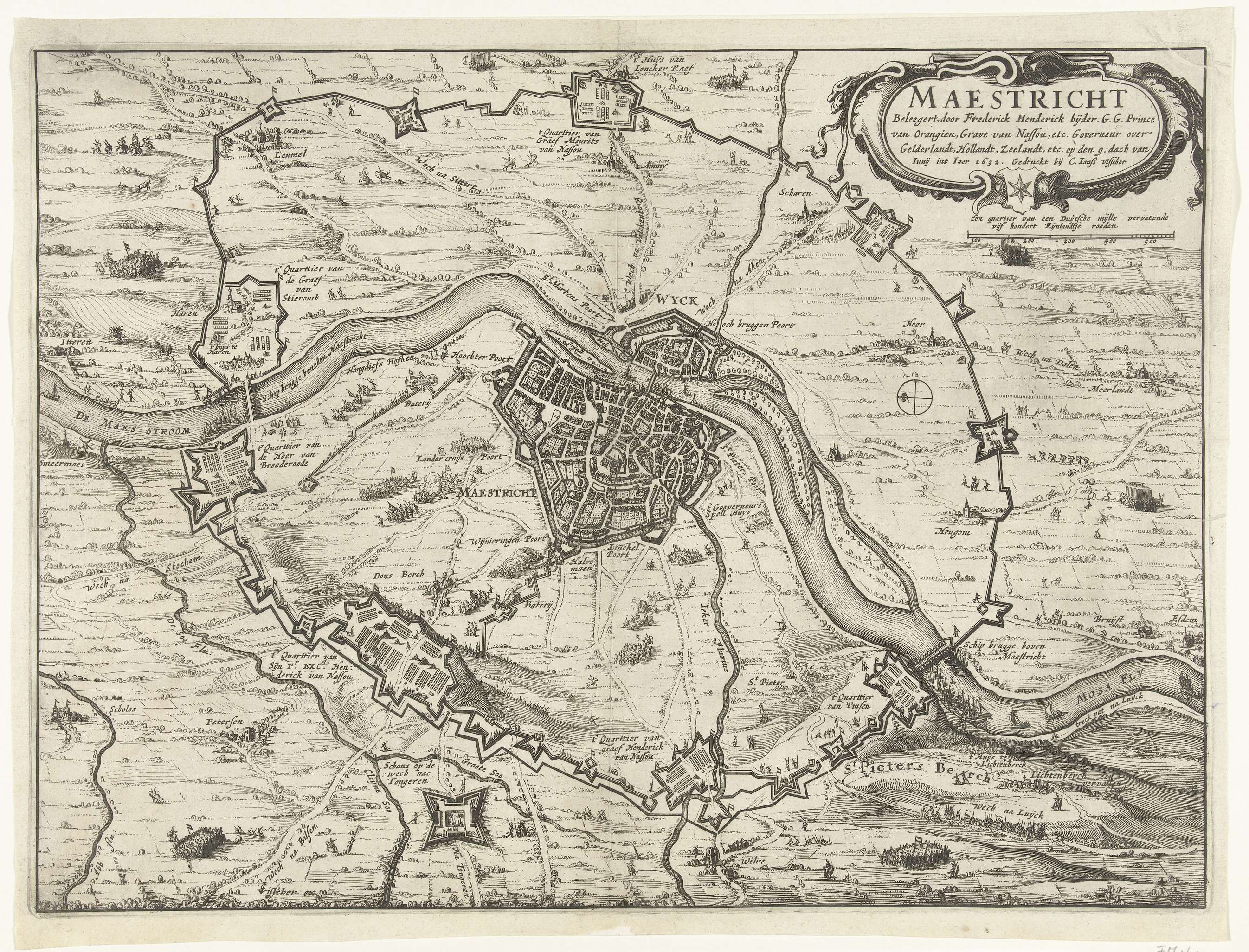 Kaart van het beleg van Maastricht door het Staatse leger onder stadhouder Frederik Hendrik, 9 juni tot 21 augustus 1632. Omsingeling van de stad met de verschillende legerkampen van de belegeraars. Bij de prent behoort een tekstblad.