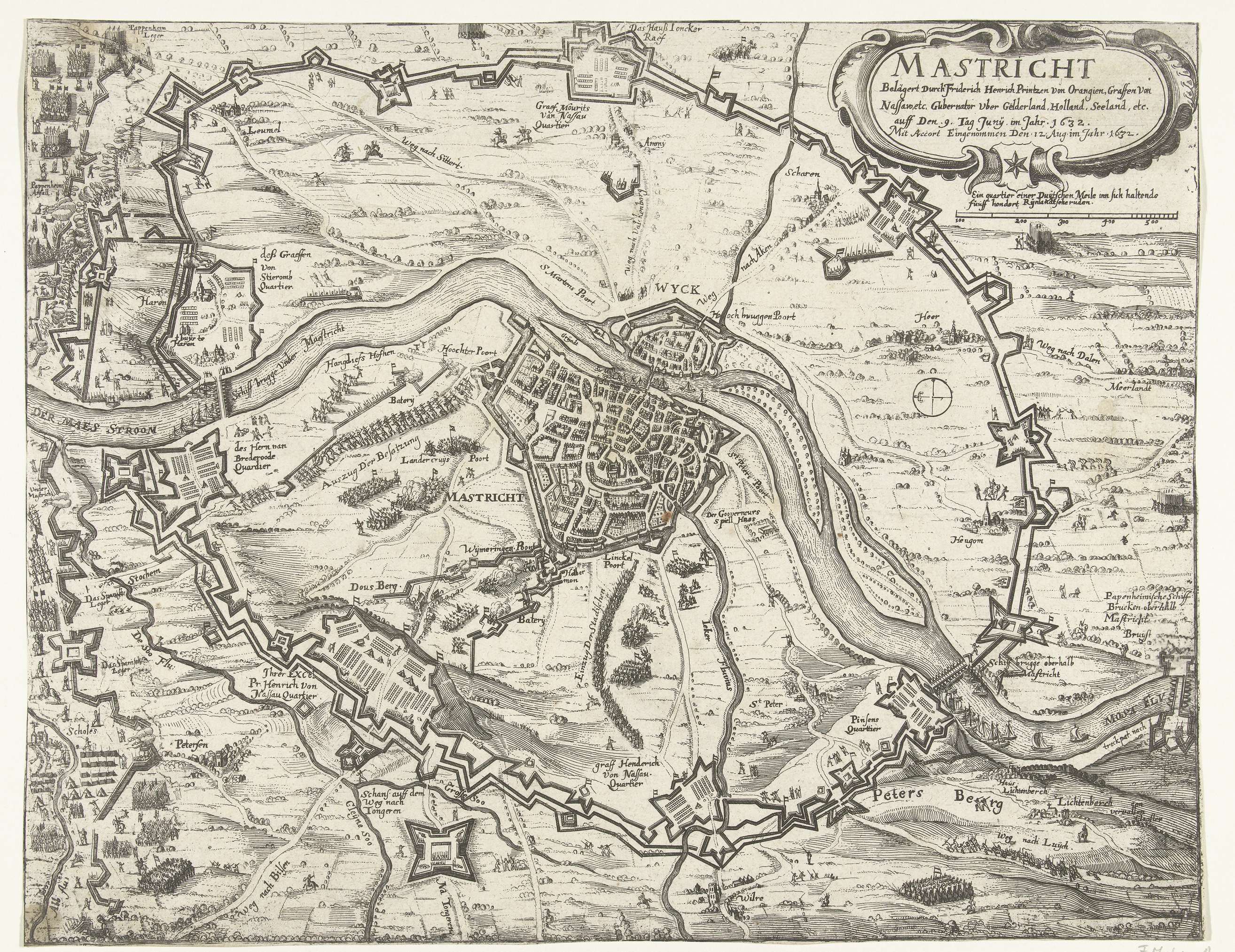 Kaart van het beleg van Maastricht door het Staatse leger onder stadhouder Frederik Hendrik, 9 juni tot 21 augustus 1632. Omsingeling van de stad met de verschillende legerkampen van de belegeraars. Aan de linkerkant van de stad de uittocht van de bezetters, onderaan de intocht van het Staatse leger. Met opschriften in de voorstelling in ...