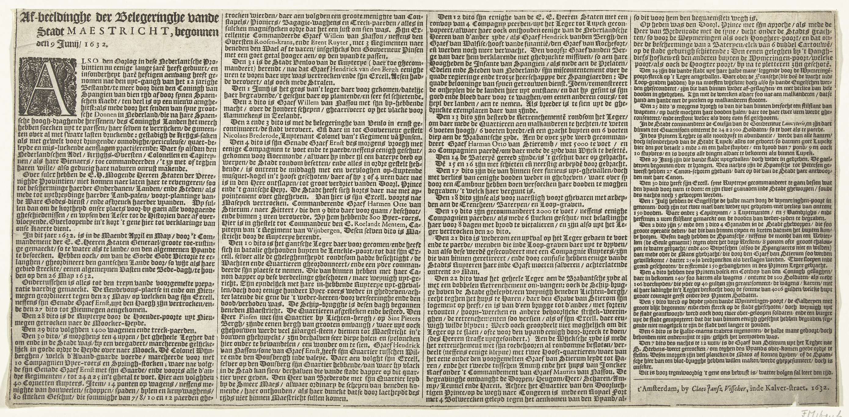 Tekstblad behorend bij een - onbekende - kaart van het beleg van Maastricht door het Staatse leger onder stadhouder Frederik Hendrik, 9 juni tot 21 augustus 1632. Tekst in 4 kolommen in het Nederlands.