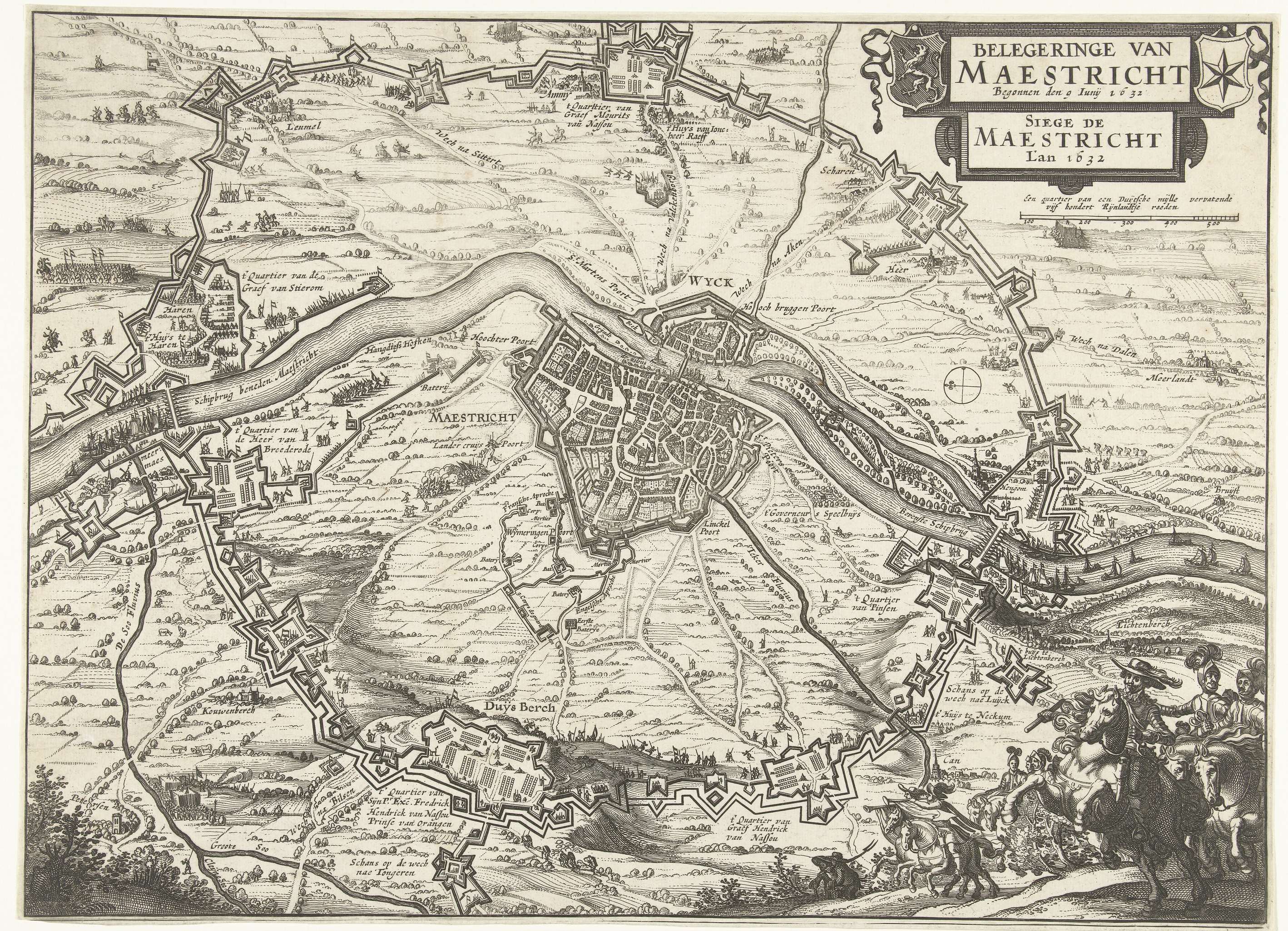 Kaart van het beleg van Maastricht door het Staatse leger onder stadhouder Frederik Hendrik, 9 juni tot 21 augustus 1632. Omsingeling van de stad met de verschillende legerkampen van de belegeraars. Rechtsonder de stadhouder met officieren te paard.