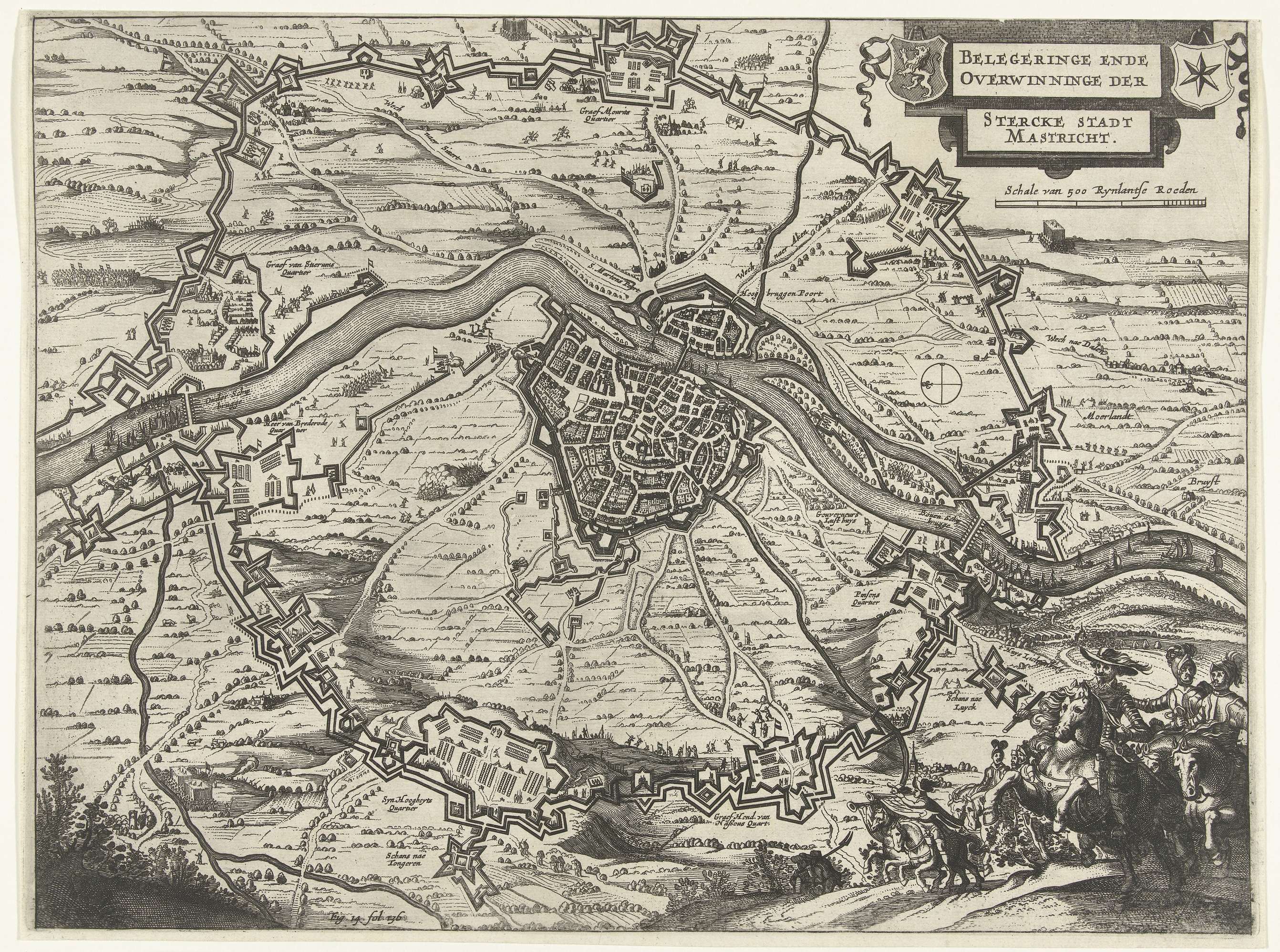 Kaart van het beleg van Maastricht door het Staatse leger onder stadhouder Frederik Hendrik, 9 juni tot 21 augustus 1632. Omsingeling van de stad met de verschillende legerkampen van de belegeraars. Rechtsonder de stadhouder met officieren te paard. Gemerkt linksonder: Fig. 14 fol. 136.
