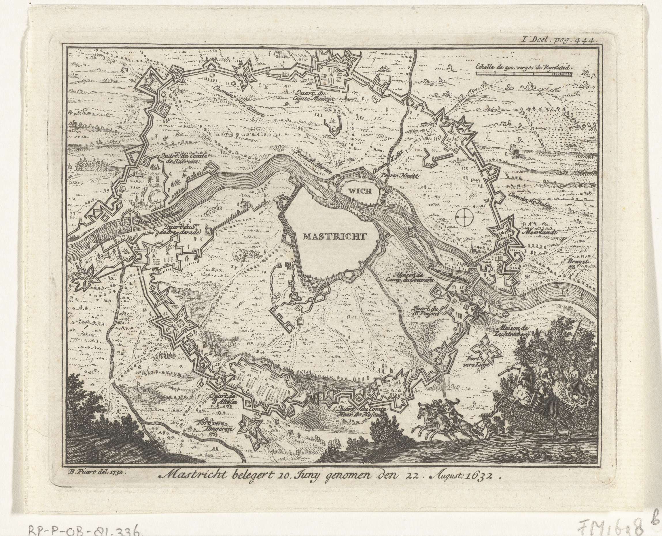 Kaartje van het beleg van Maastricht door het Staatse leger onder stadhouder Frederik Hendrik, 9 juni tot 21 augustus 1632. Omsingeling van de stad met de verschillende legerkampen van de belegeraars. Rechtsonder de stadhouder met officieren te paard. Gemerkt rechtsboven: I Deel. pag. 444.
