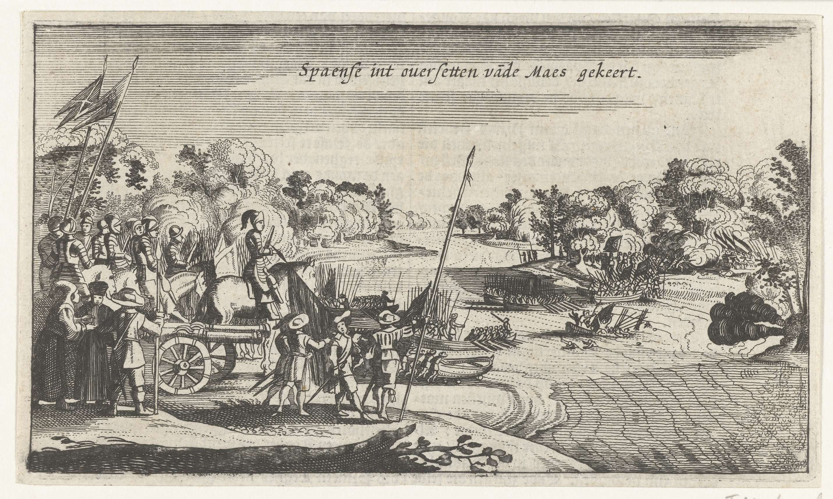 Mislukt poging van het Spaanse leger om de Maas te steken in een poging om de stad te ontzetten. De sloepen met Spaanse soldaten worden beschoten en tot zinken gebracht. Episode uit het beleg van Maastricht door het Staatse leger onder Frederik Hendrik, 9 juni tot 21 augustus 1632. Bedrukt op achterzijde met tekst in ...