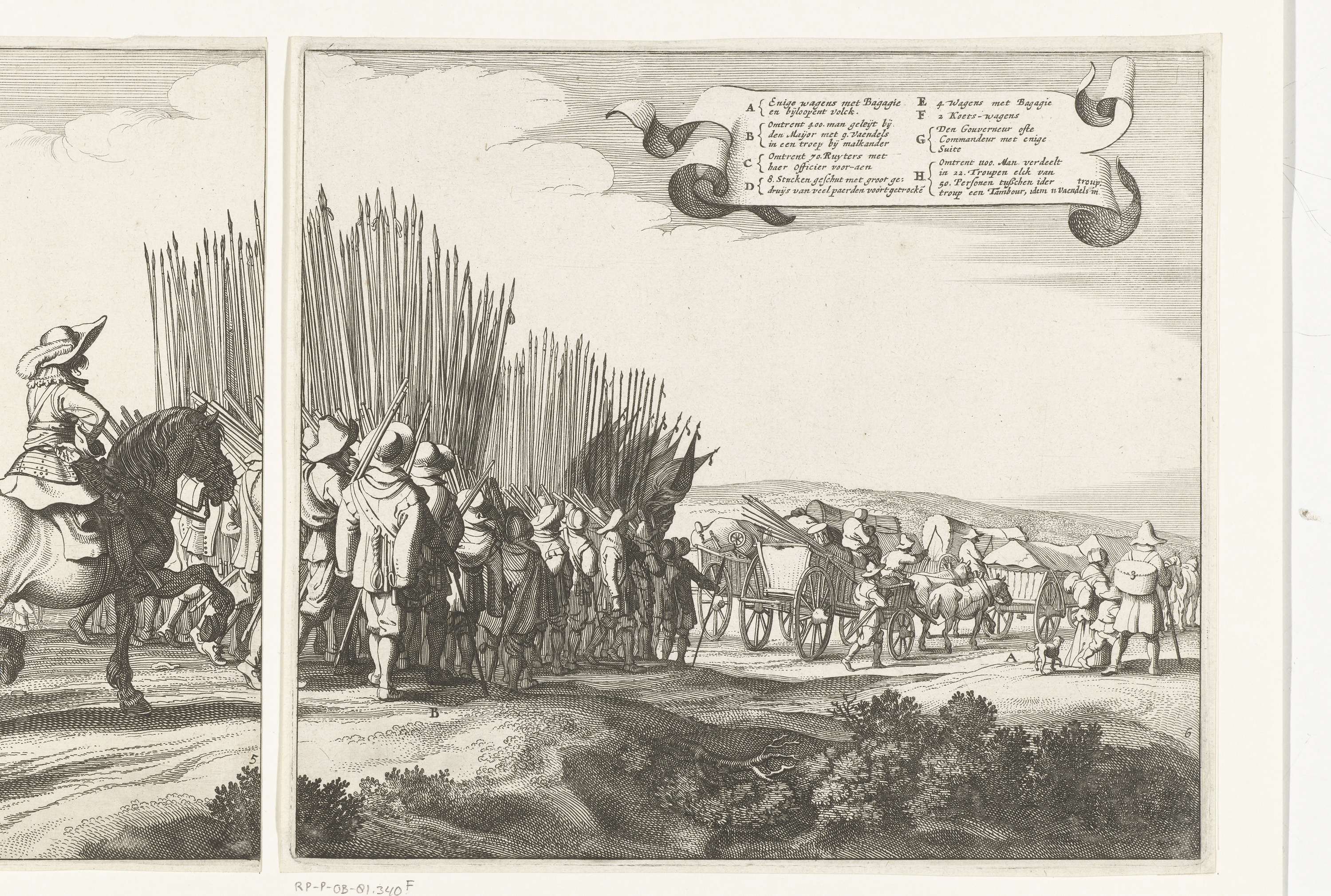 Uittocht van het Spaanse leger uit Maastricht, 23 augustus 1632. Fries van zes genummerd platen, plaat nr. 6. De infanterie en wagens van het vertrekkende leger. In de lucht een cartouche met de legenda A-H.