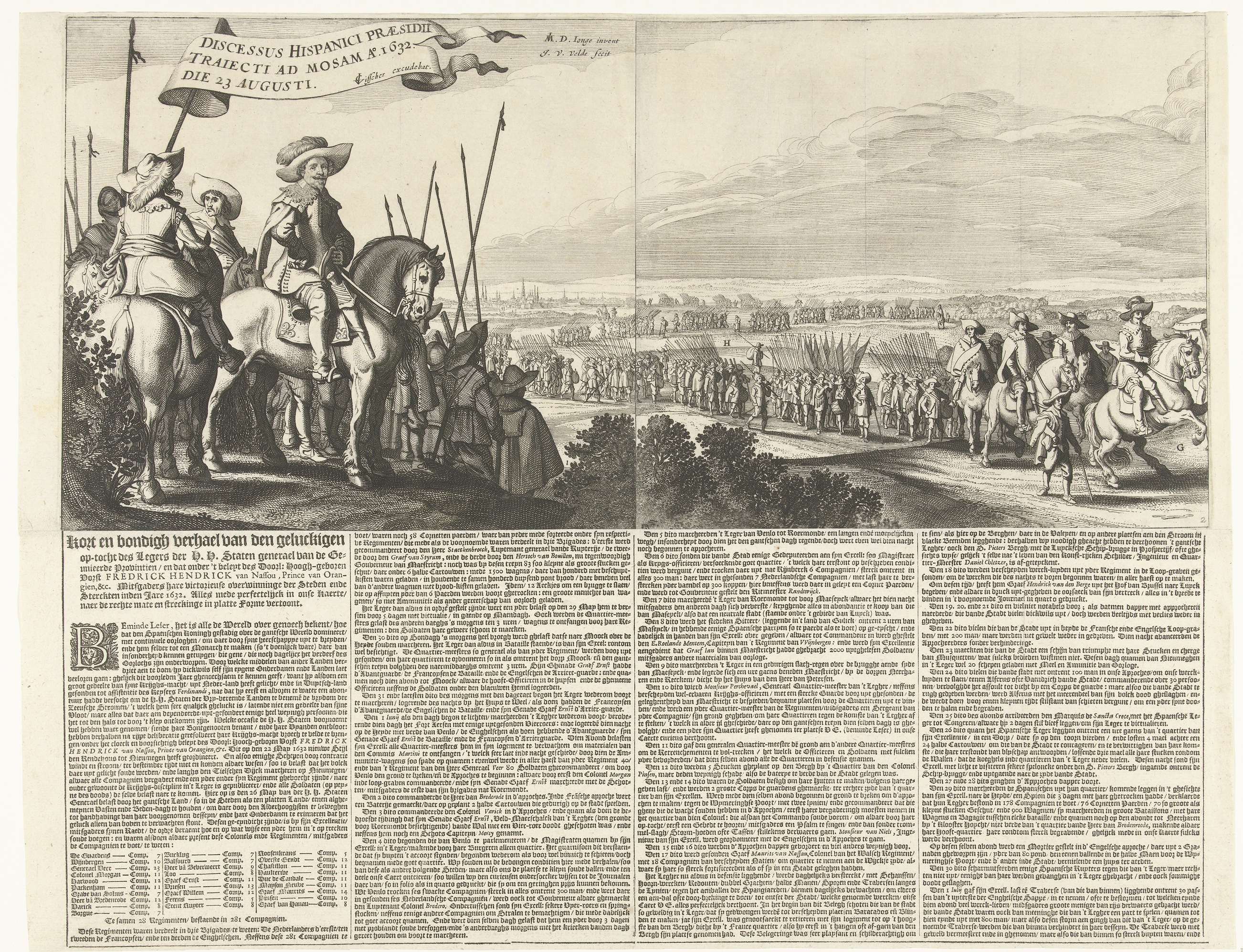 Uittocht van het Spaanse leger uit Maastricht, 23 augustus 1632. Fries van zes genummerd platen, platen nrs. 1 en 2 aan elkaar geplakt. Het voorbij marcheren van de vertrekkende Spanjaarden gade geslagen door stadhouder Frederik Hendrik te paard met zijn officieren. Onder elk van de platen tekst in twee kolommen in het Nederlands.