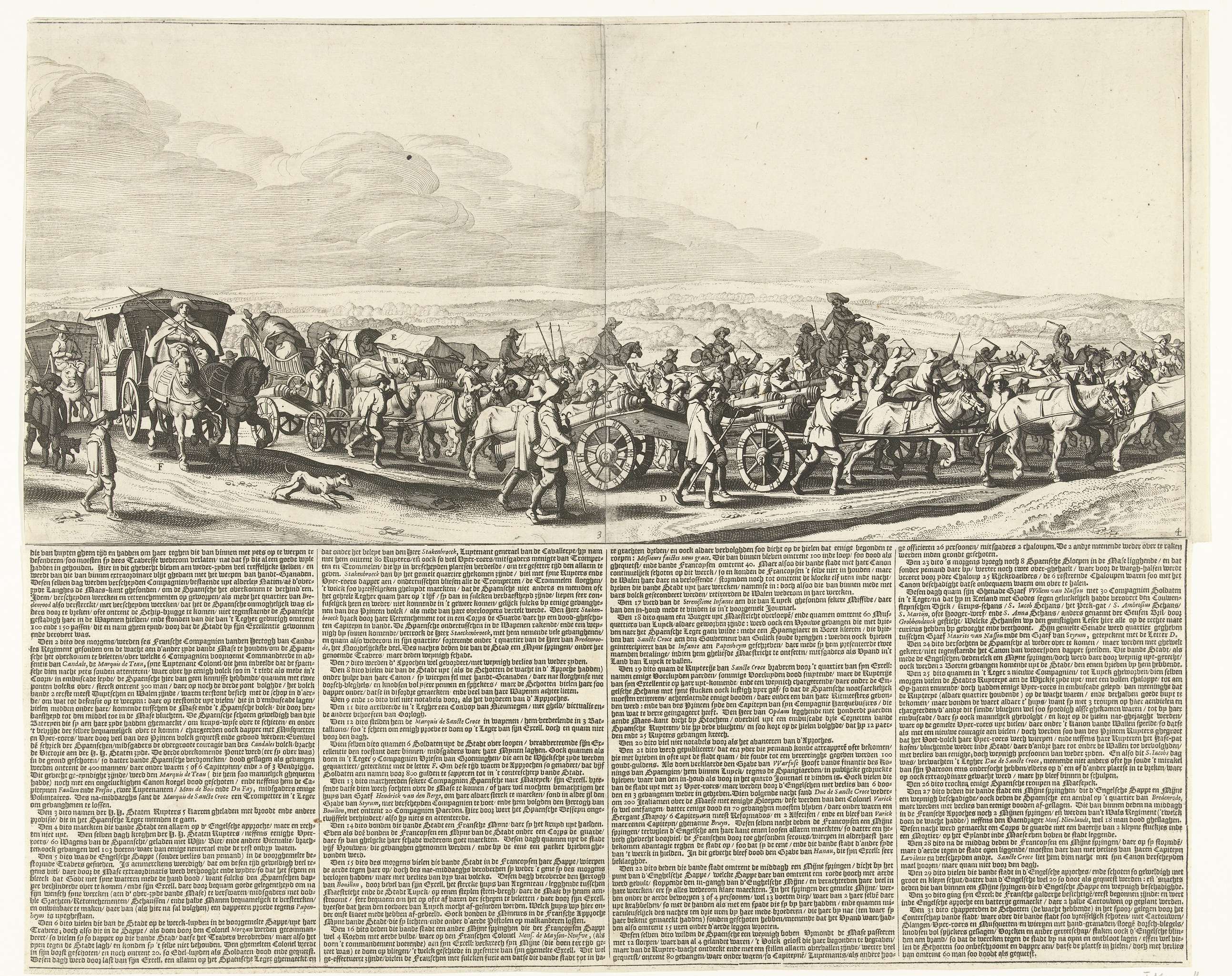 Uittocht van het Spaanse leger uit Maastricht, 23 augustus 1632. Fries van zes genummerd platen, platen nrs. 3 en 4 aan elkaar geplakt. Rijtuigen, wagens en artillerie in de stoet van vertrekkende soldaten. Onder elk van de platen tekst in twee kolommen in het Nederlands.