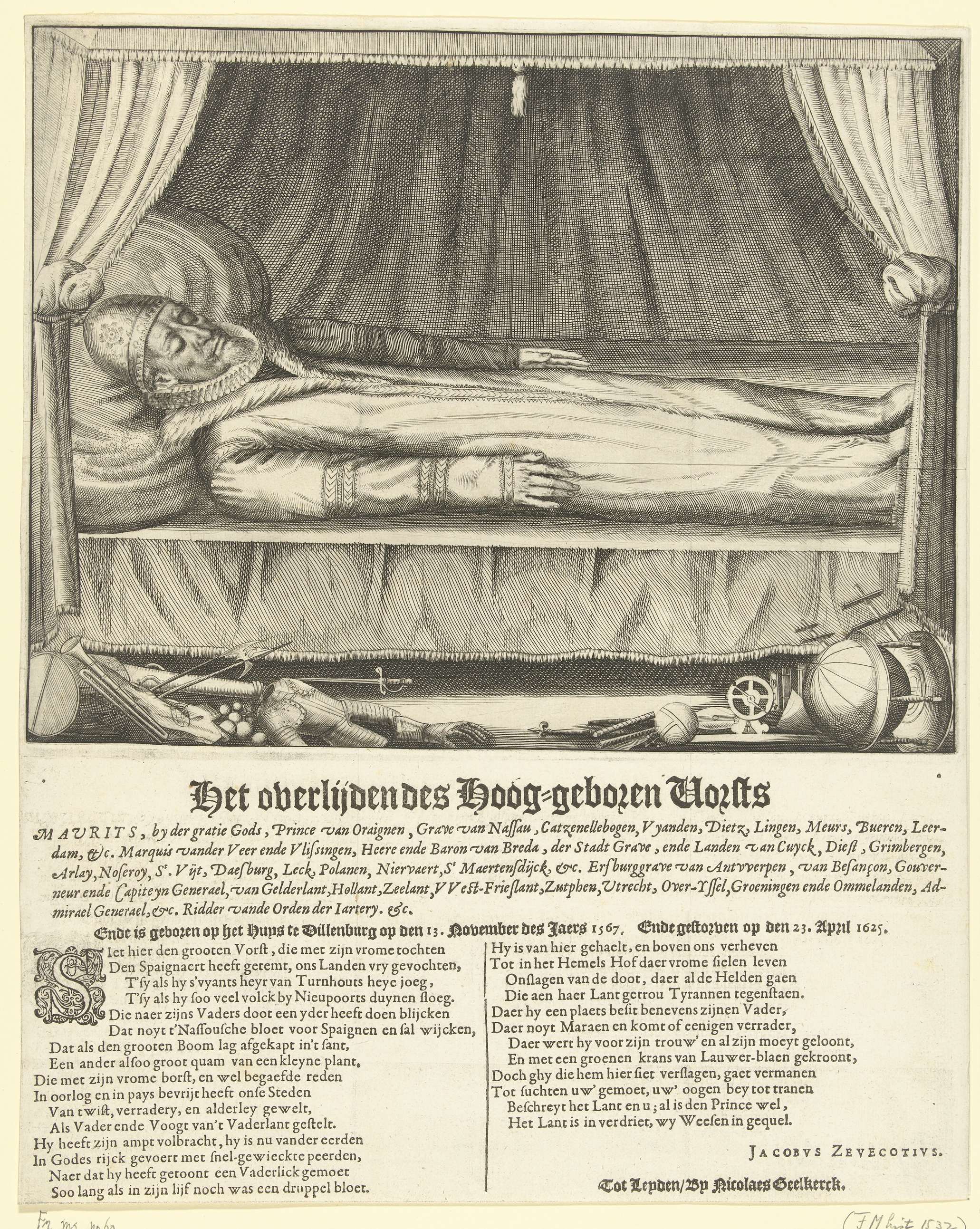 Praalbed van Maurits, overleden te Den Haag op 23 april 1625. De prins in tabbaard uitgestrekt liggend op zijn praalbed. Op de grond op de voorgrond links militaire attributen en rechts wetenschappelijke instrumenten. Onder de voorstelling gedrukt op het blad de titel met alle titels van de prins in zes regels. Daaronder een vers in ...