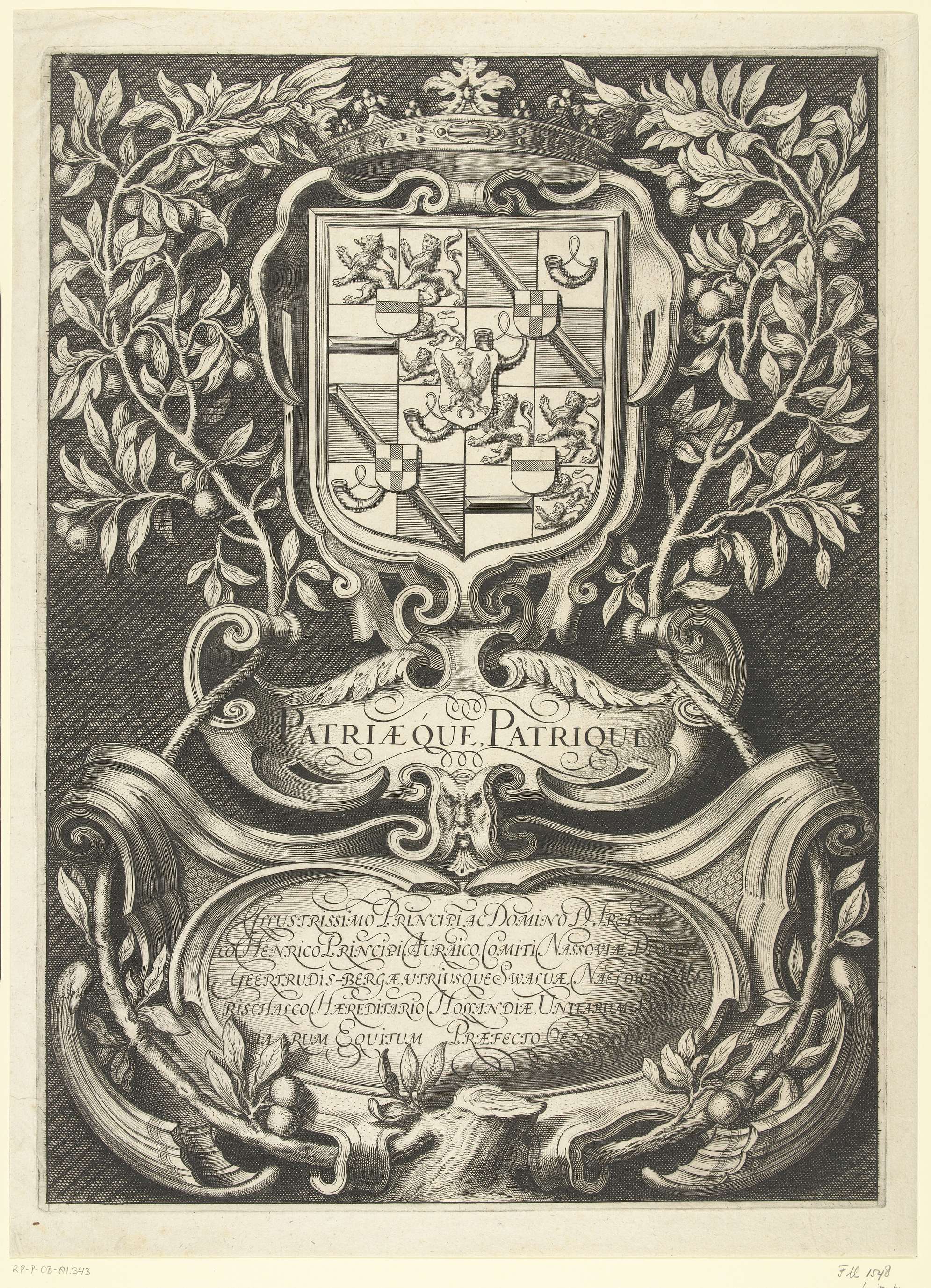 Wapen van Frederik Hendrik met een kroon. In het midden zijn lijfspreuk. In een cartouche vijf regels Latijnse tekst. Geheel in een geornamenteerde omlijsting vervlochten met de Oranjeboom.