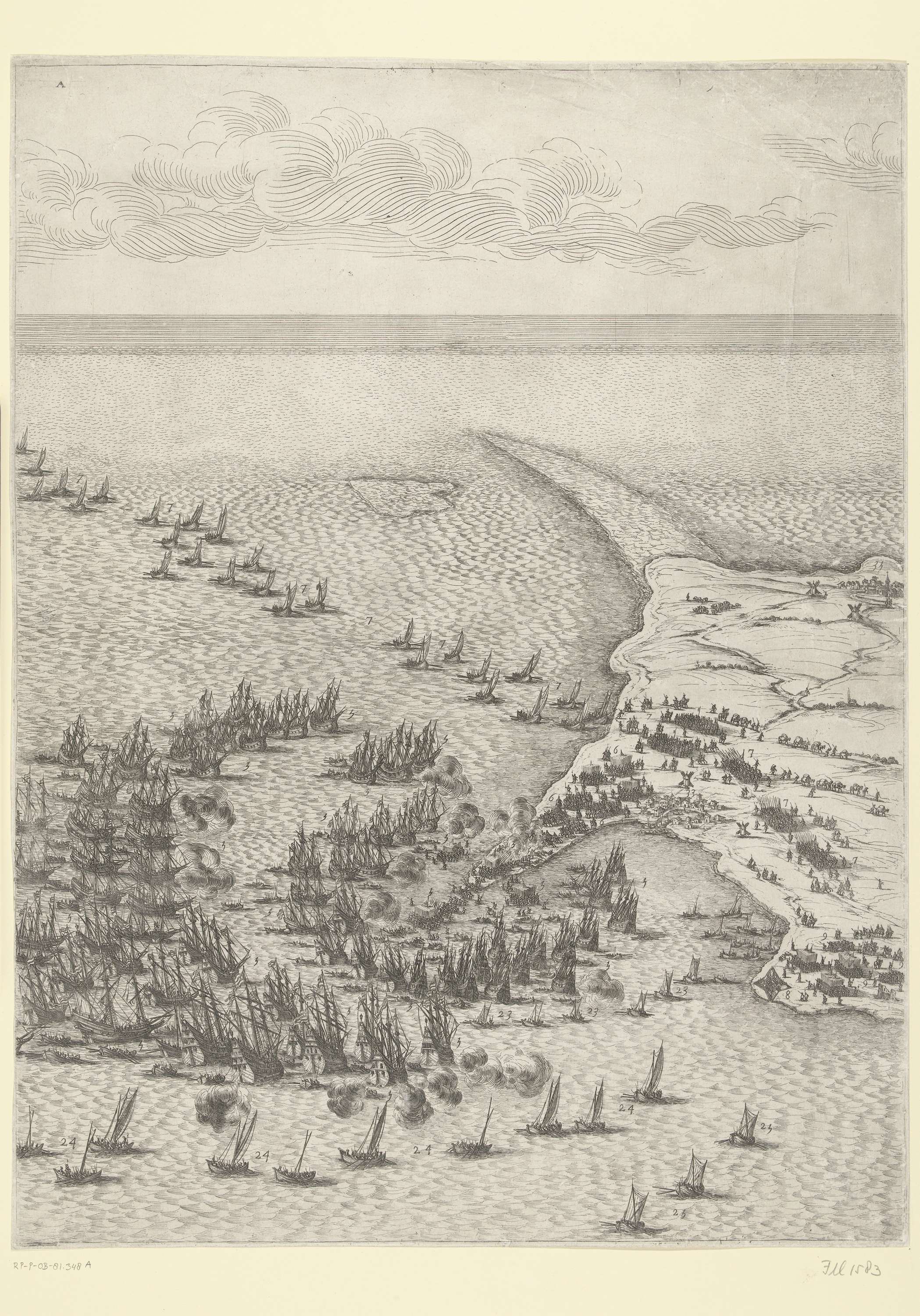Grote prent van het beleg van de citadel Saint Martin op het Île de Ré in 1627, dat werd uitgevoerd door Engelse troepen onder leiding van de hertog van Buckingham in steun van de opstandige hugenoten en werd beëindigd door Franse troepen onder leiding van kardinaal Richelieu. Centrale kaart, deel linksboven. Op dit blad de ...
