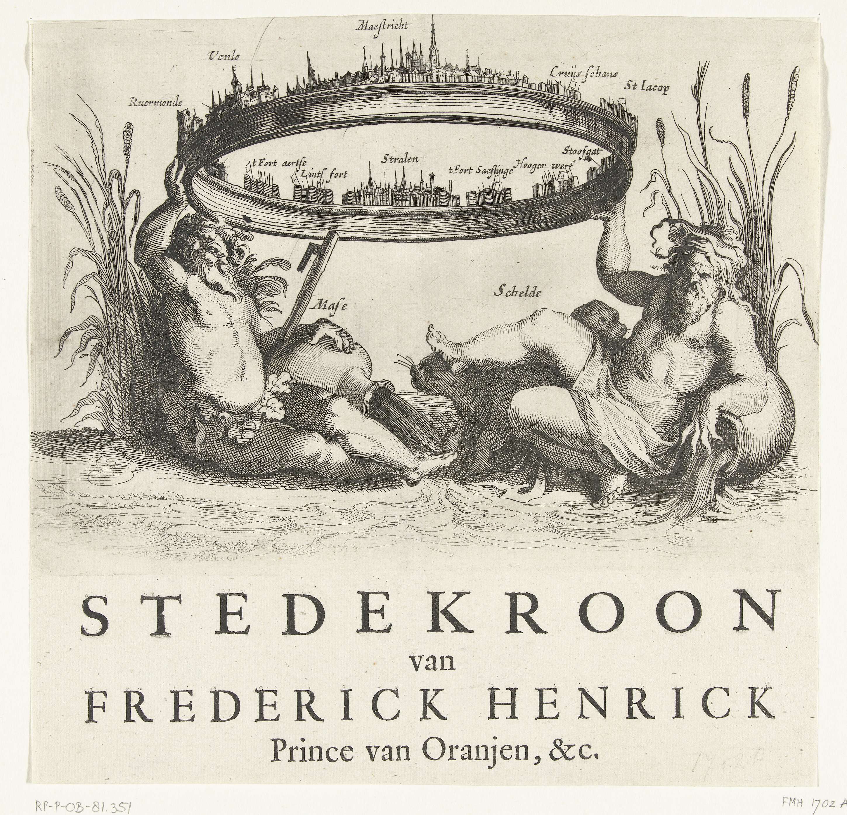 Allegorie op de verovering van Maastricht, Venlo, Roermond en andere steden door stadhouder Frederik Hendrik, 1632. De riviergoden van de Maas en de Schelde dragen een grote kroon met de veroverde steden.