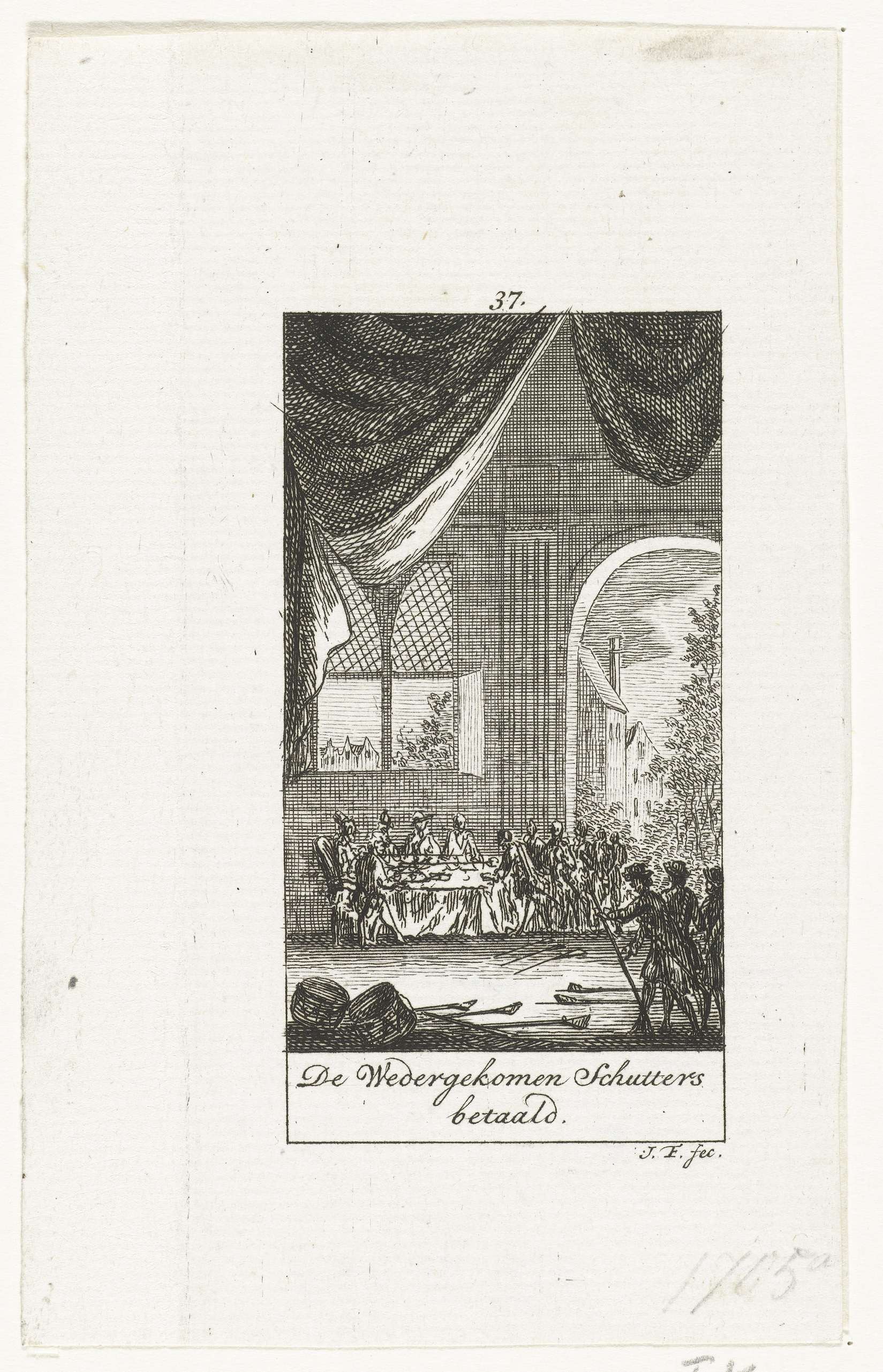 Betaling van de uit Nijmegen teruggekeerde Amsterdamse schutters, 6 oktober 1632. Interieur waarin de soldaten aan een tafel hun soldij ontvangen. Genummerd 37.