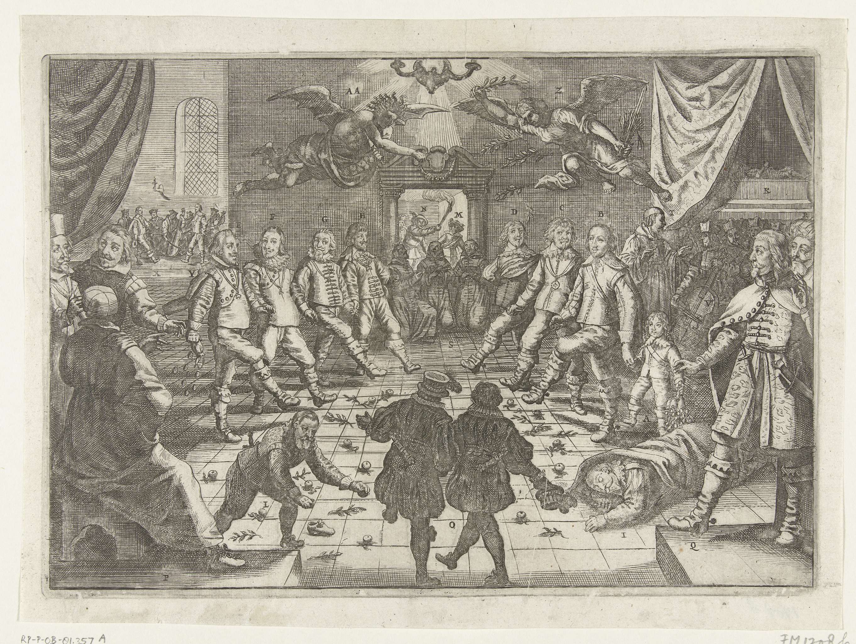 Spotprent op de vredesonderhandelingen met Spanje, 1632. Balzaal waarin de Europese vorsten samen dansen. Op de vloer liggen olijftakken en twistappels, gestrooid door de Vrede en de Nijd die in de lucht vliegen. Rechts de Franse koning Lodewijk XIII met de Dauphin, prins Frederik Hendrik en de Zweedse generaal Torstenson (Banier), links de Spaanse koning ...