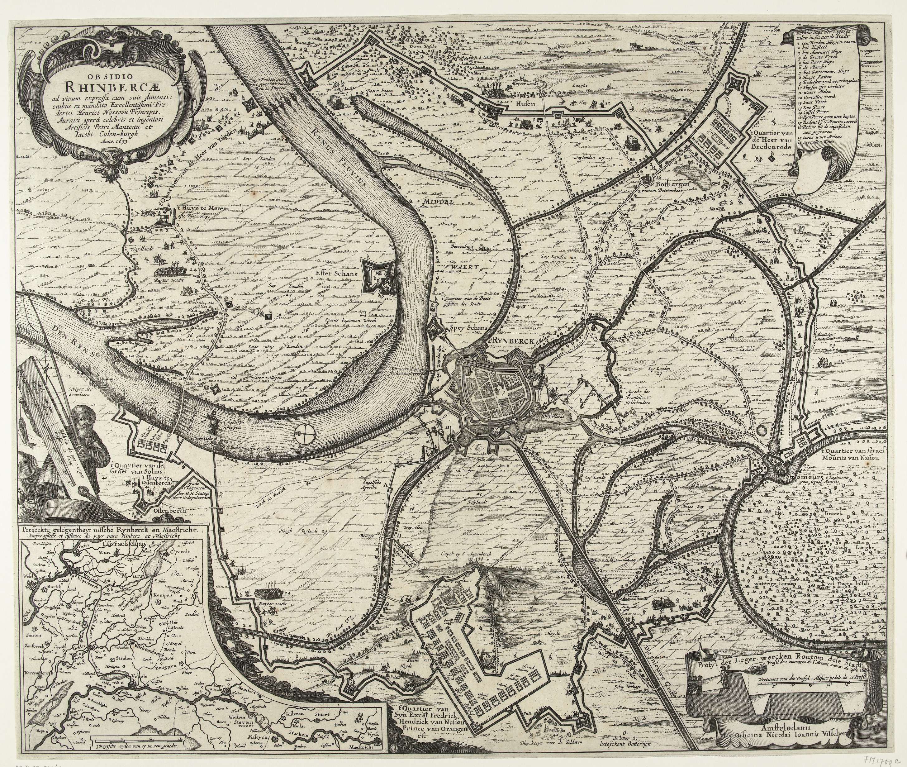 Kaart van het beleg en de verovering van Rijnberg door het Staatse leger onder Frederik Hendrik, 16 mei - 2 juni 1633. Centraal de stad Rijnberg aan de Rijn, onderaan het kwartier van de stadhouder. Rechtsboven een banderol met de legenda 1-20 in het Nederlands. Linksonder een inzet met een kaartje van het gebied tussen ...