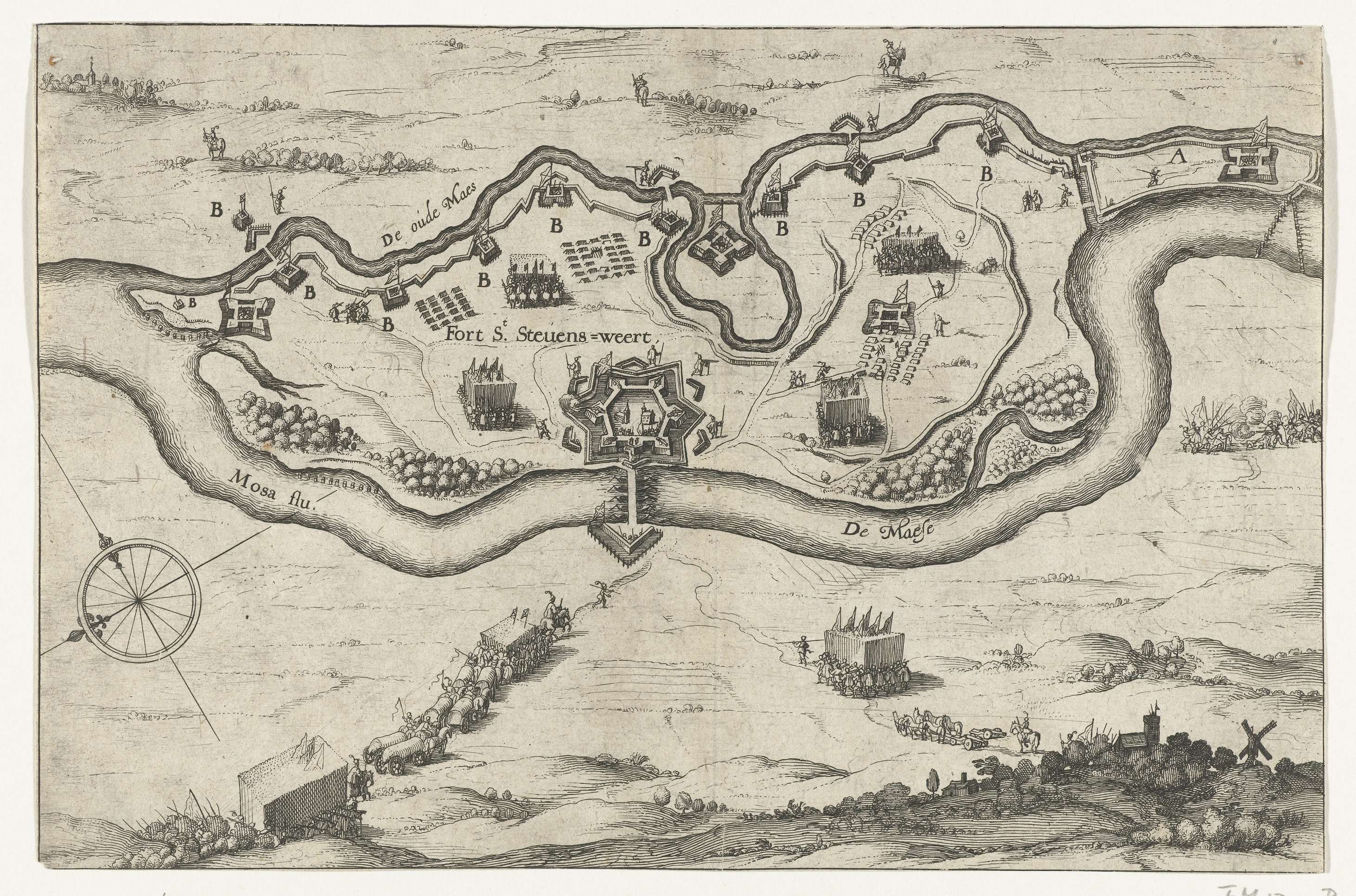 Plan met de versterkingen in het gebied rond Stevensweert aan de Maas, aangelegd door de Spanjaarden onder de markies van Aytona, juli 1633. Op de voorgrond trekken troepen en konvooien door het land, rechts een dorpje met een molen.