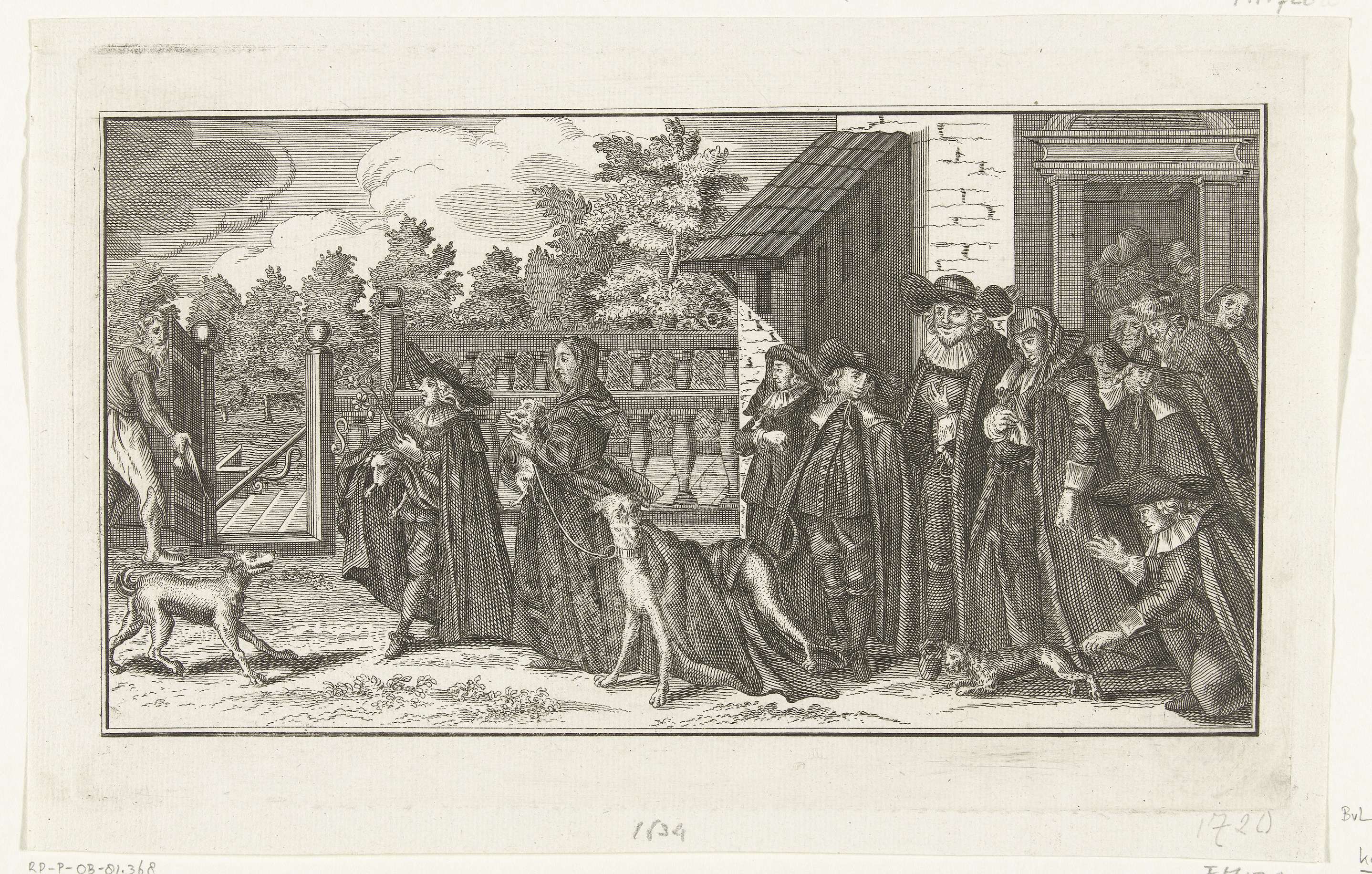 Begrafenis van Tijter, de hond van de Leidse schout Mr. Willem de Bondt, 29 januari 1634. Begrafenisoptocht van verschillende personen in rouwkleding, waaronder de schout, een hevig vervolger van de remonstranten te Leiden.