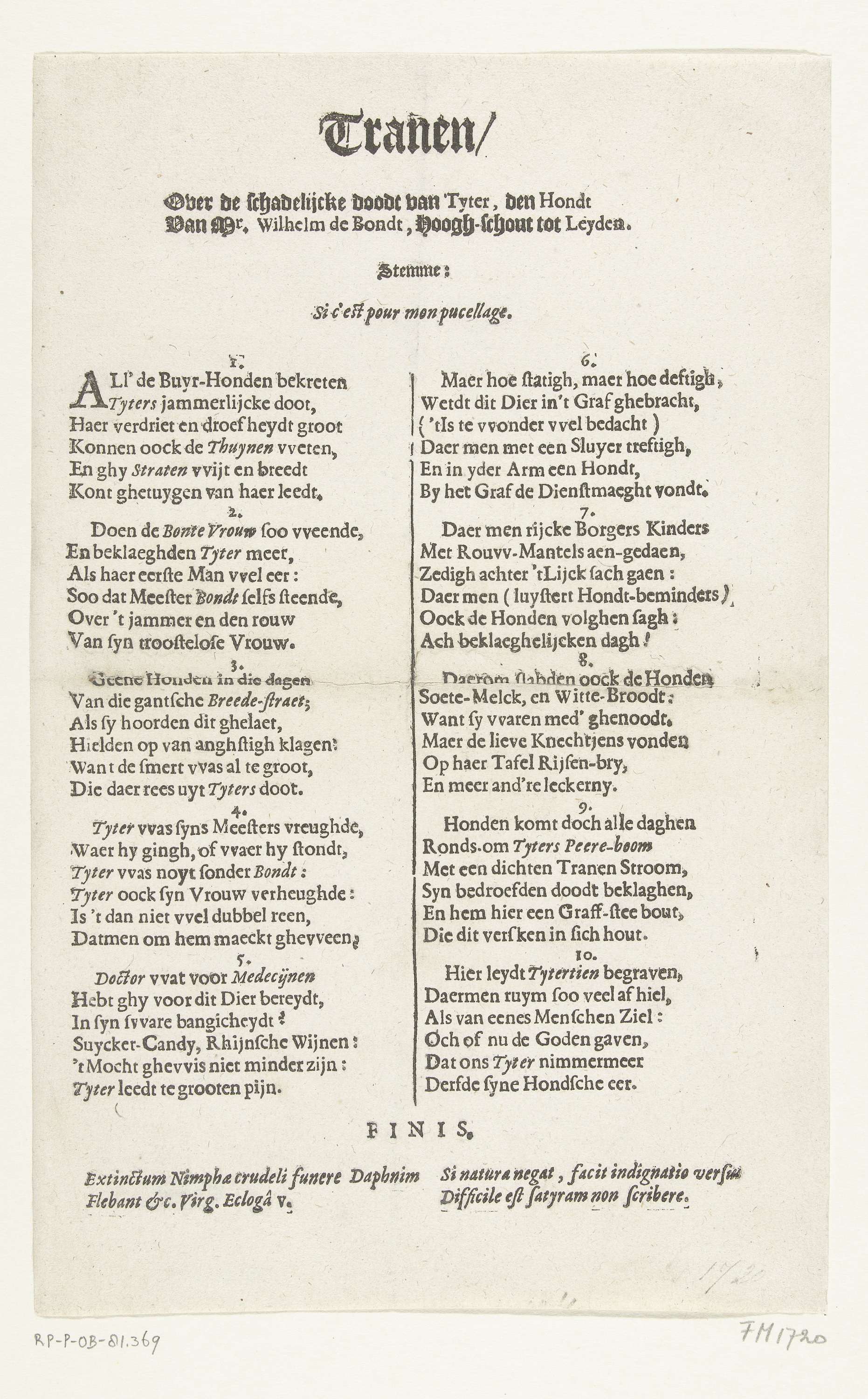 Spotvers op de begrafenis van Tijter, de hond van de Leidse schout Mr. Willem de Bondt, 29 januari 1634. Tekstblad met het vers in 10 genummerde coupletten.