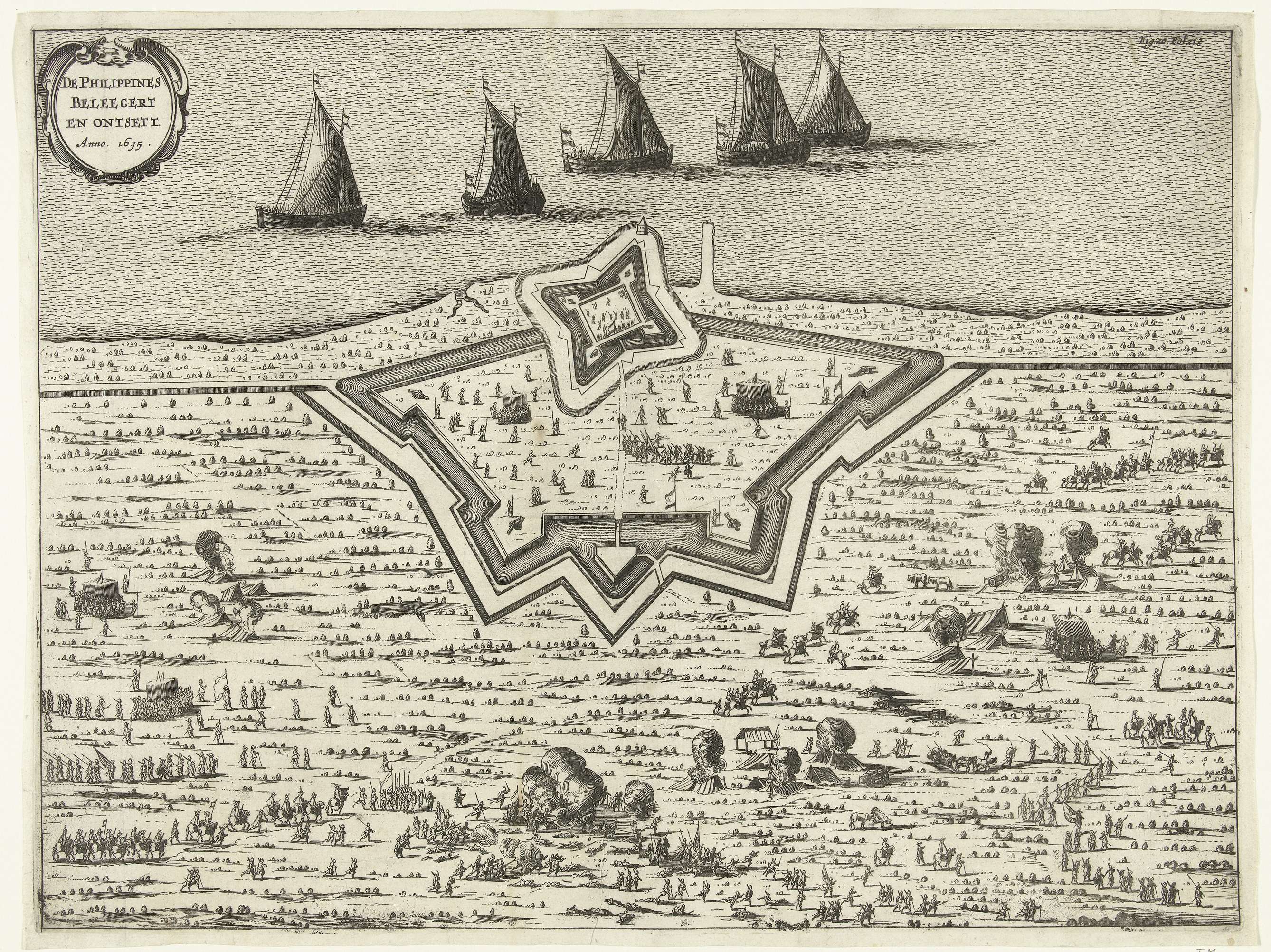 De belegering door het Spaanse leger en het ontzet door het Staatse leger onder Frederik Hendrik van het fort Philippines (Fort Sint-Philips) in Vlaanderen op de oever van de Schelde op 20 mei 1635. Plattegrond van het fort aan de oever, op het land een legerkamp en oprukkende cavalerie. Boven in het water vijf Hollandse ...