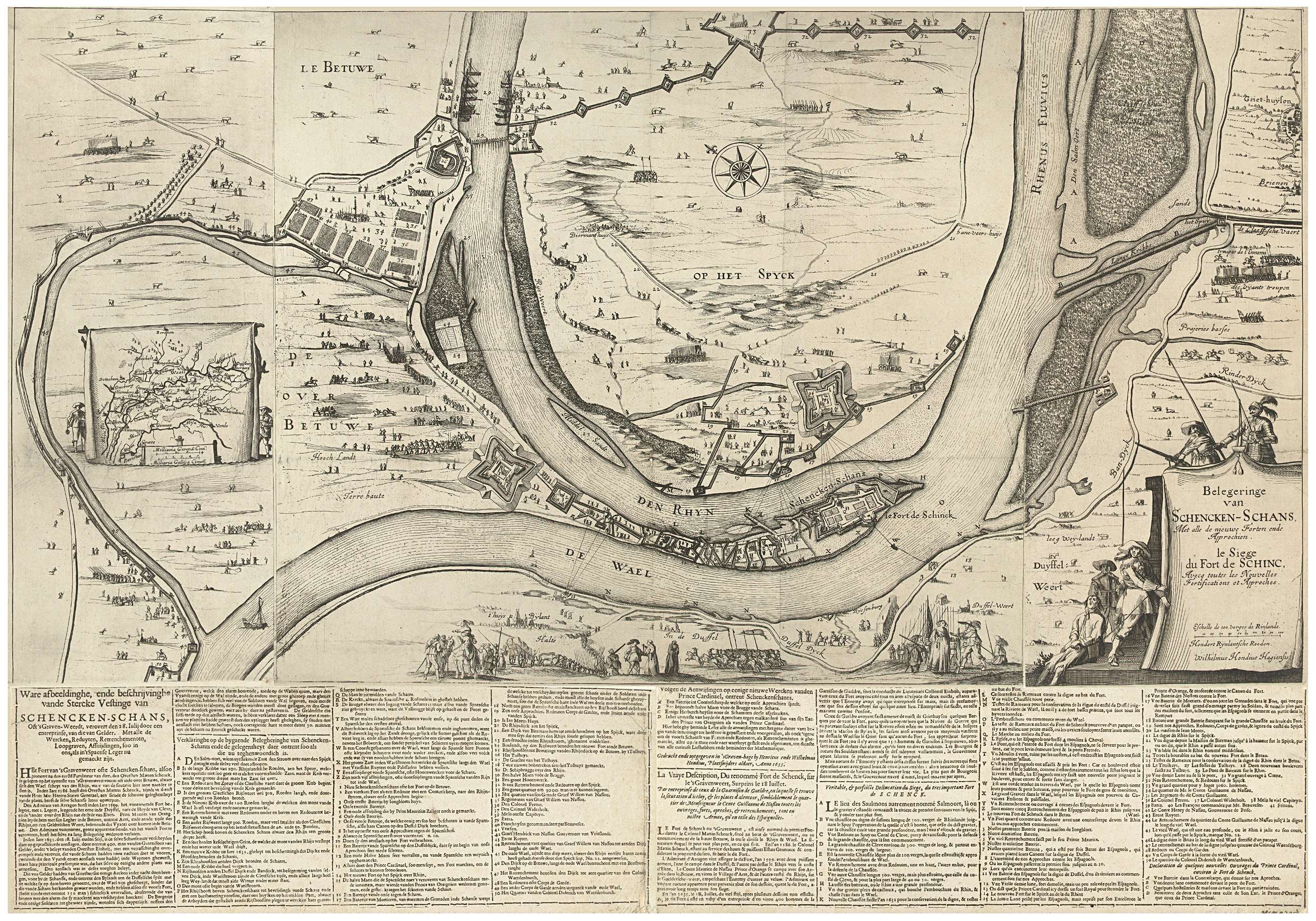 Schenckenschans door de Spanjaarden bij verrassing ingenomen, 28 juli 1635. Kaart van het rivierengebied met de Schenckenschans op de splitsing van de Rijn en Waal. Het ongemonteerd geheel bestaande uit drie platen en twee tekstbladen.