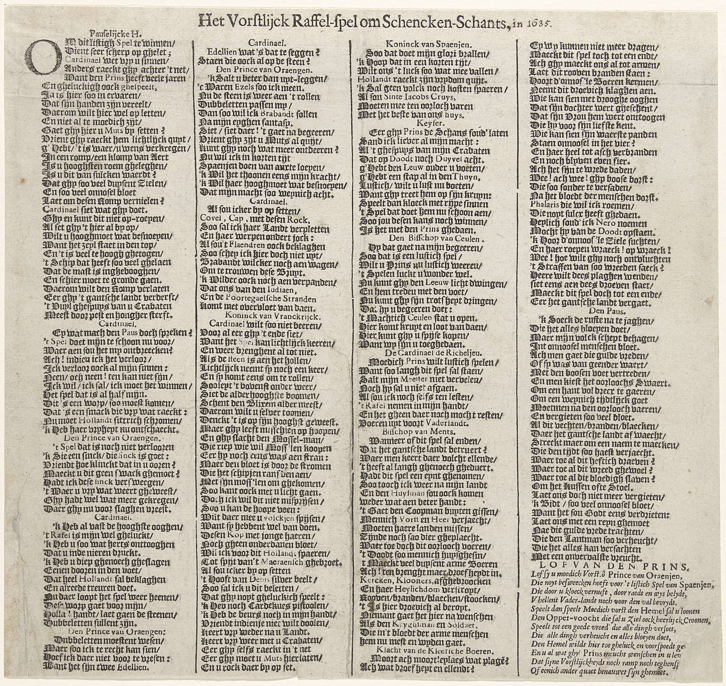 Tekstblad bij de spotprent op de strijd om Schenckenschans in de jaren 1635-1636. Afzonderlijk tekstblad met een samenspraak tussen de hoofdfiguren in 4 kolommen in het Nederlands.