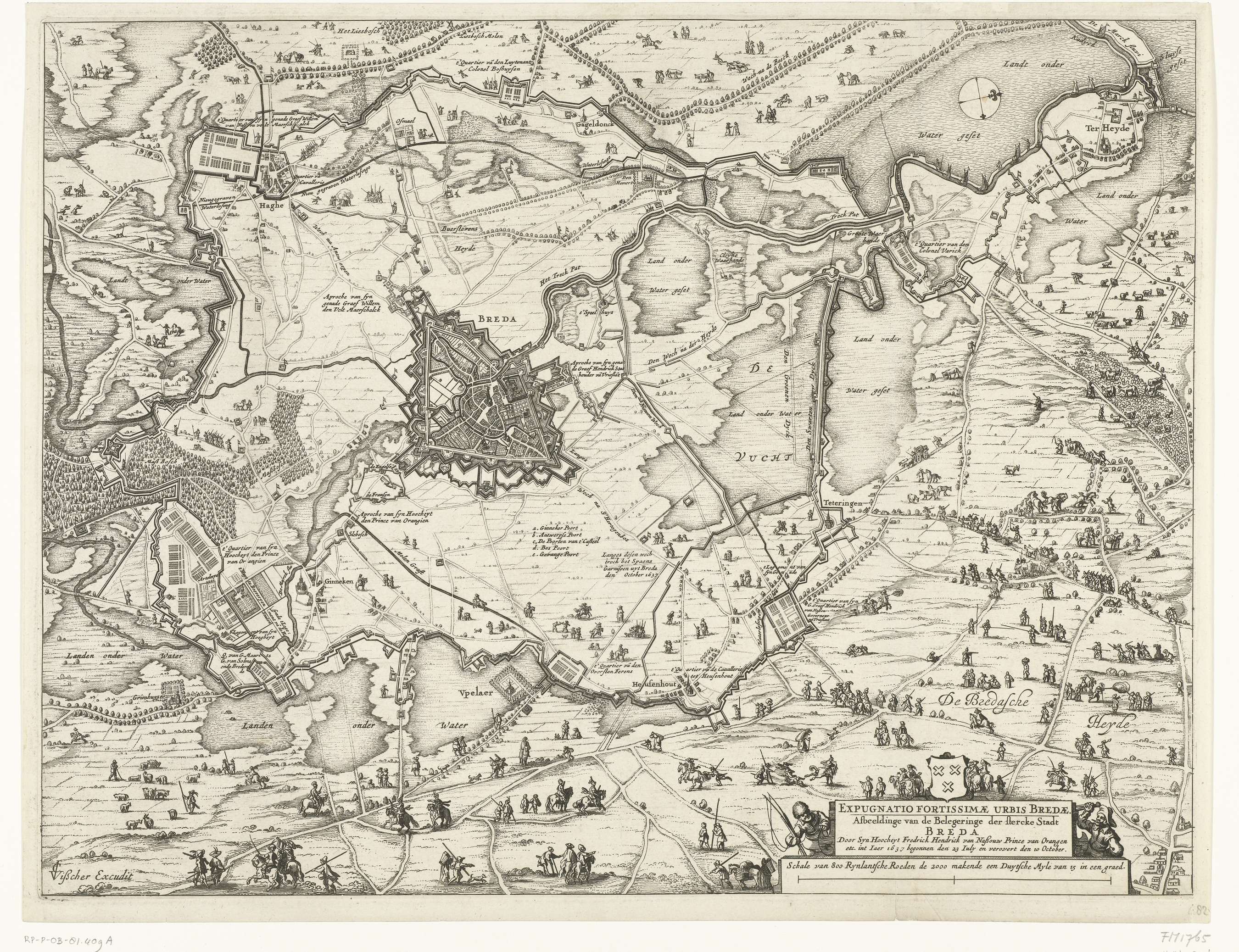 Belegering en verovering van Breda door het Staatse leger onder Frederik Hendrik, 23 juli - 10 oktober 1637. Grote kaart van de stad en omgeving bestaande uit drie bladen waarvan dit het middelste blad is. Links een plattegrond van de stad, rechtsonder een cartouche met de titel.