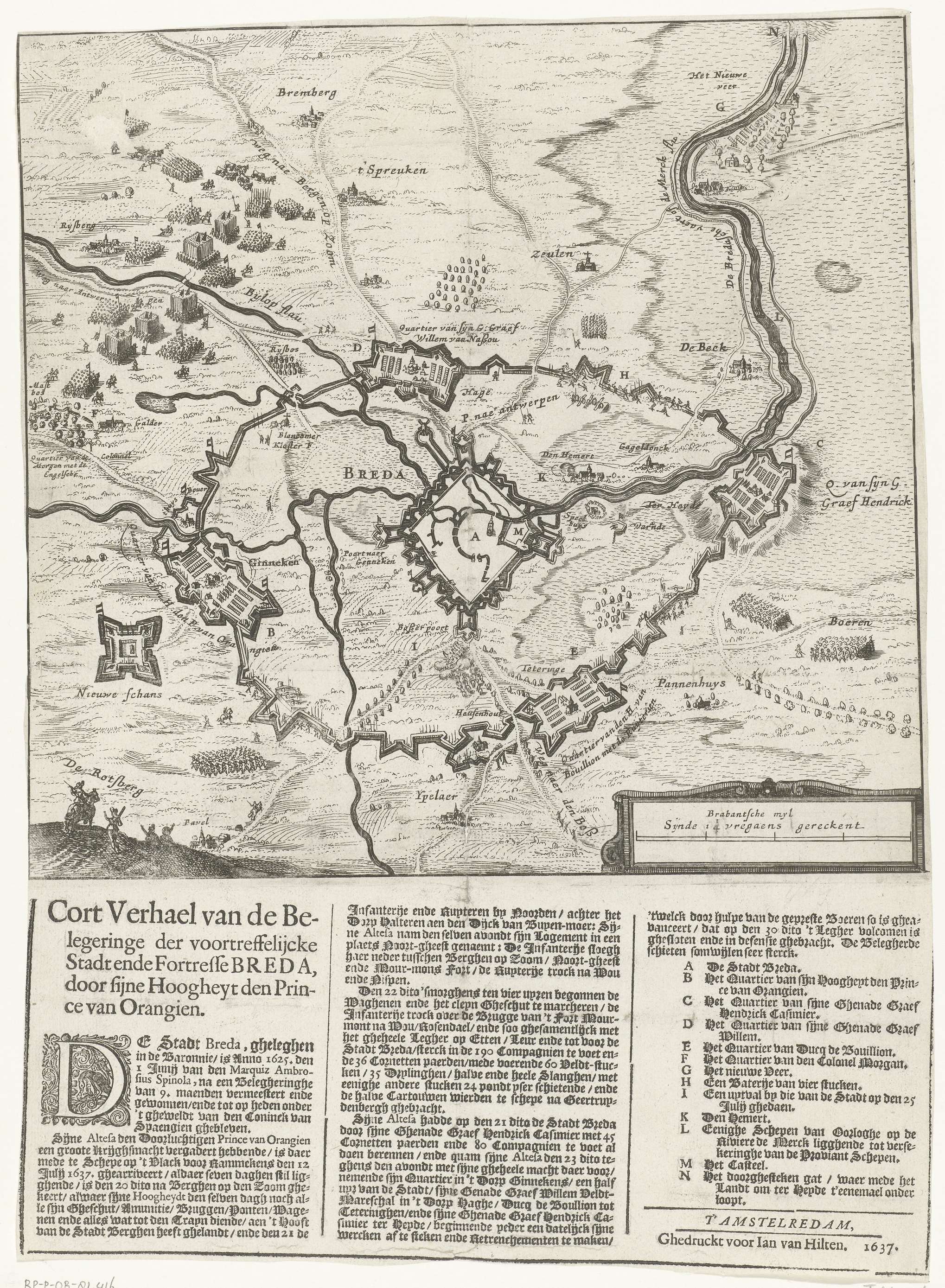 Kaart van de belegering van Breda door het Staatse leger onder Frederik Hendrik, 23 juli - 10 oktober 1637. Kaart van de stad en omgeving. Onder de voorstelling is een tekst gedrukt van 3 kolommen met de legenda A-N. In de tekst wordt 30 juli als laatste datum vermeld.