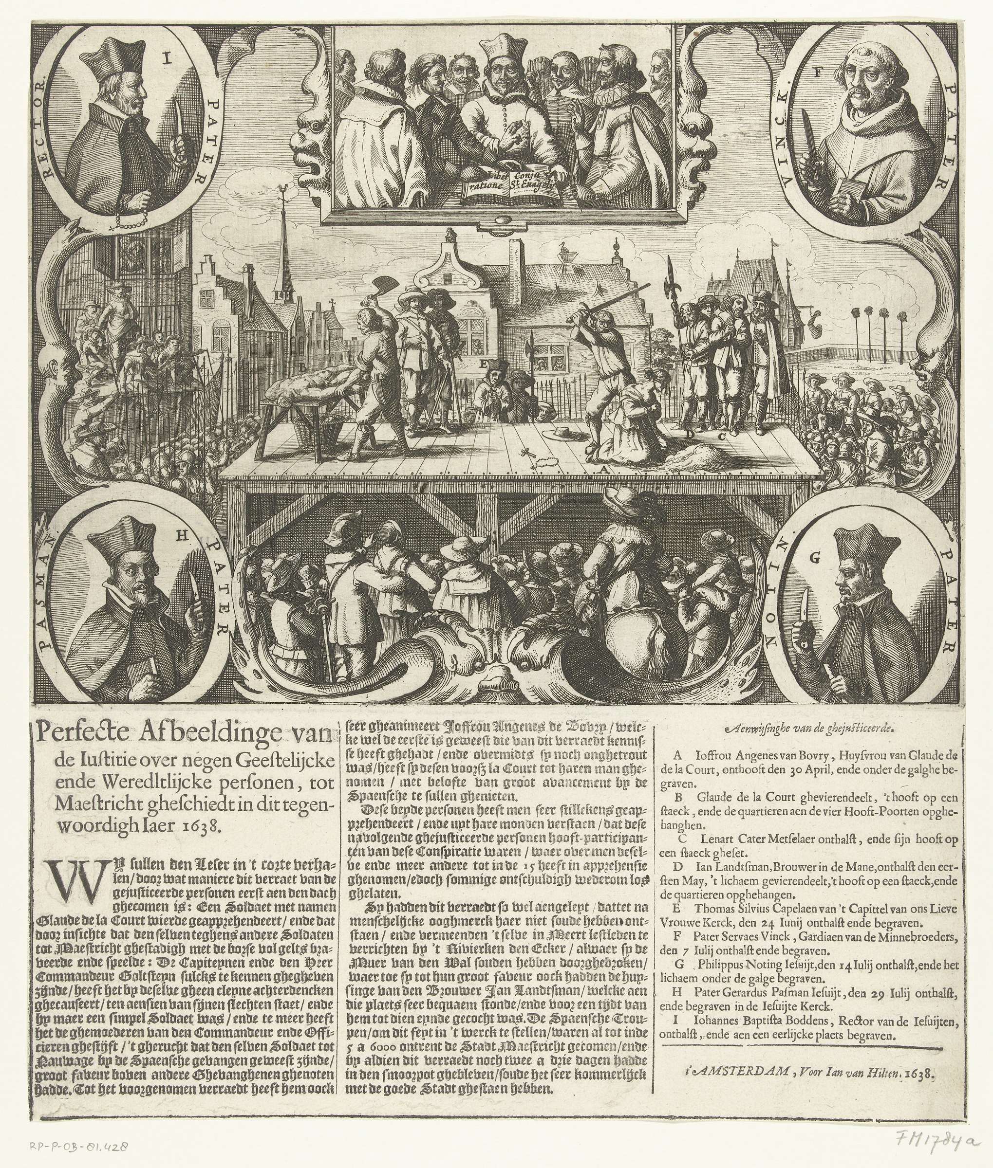Executies te Maastricht van de negen personen die samenzwoeren om Maastricht aan de Spanjaarden te verraden, 1638. Op een schavot wordt Claude de la Court gevierendeeld en zijn vrouw Angenes van Bovry onthoofd op 30 april 1638. In de hoeken portretten van de vier Roomse geestelijken die bij het complot betrokken waren en in juli ...