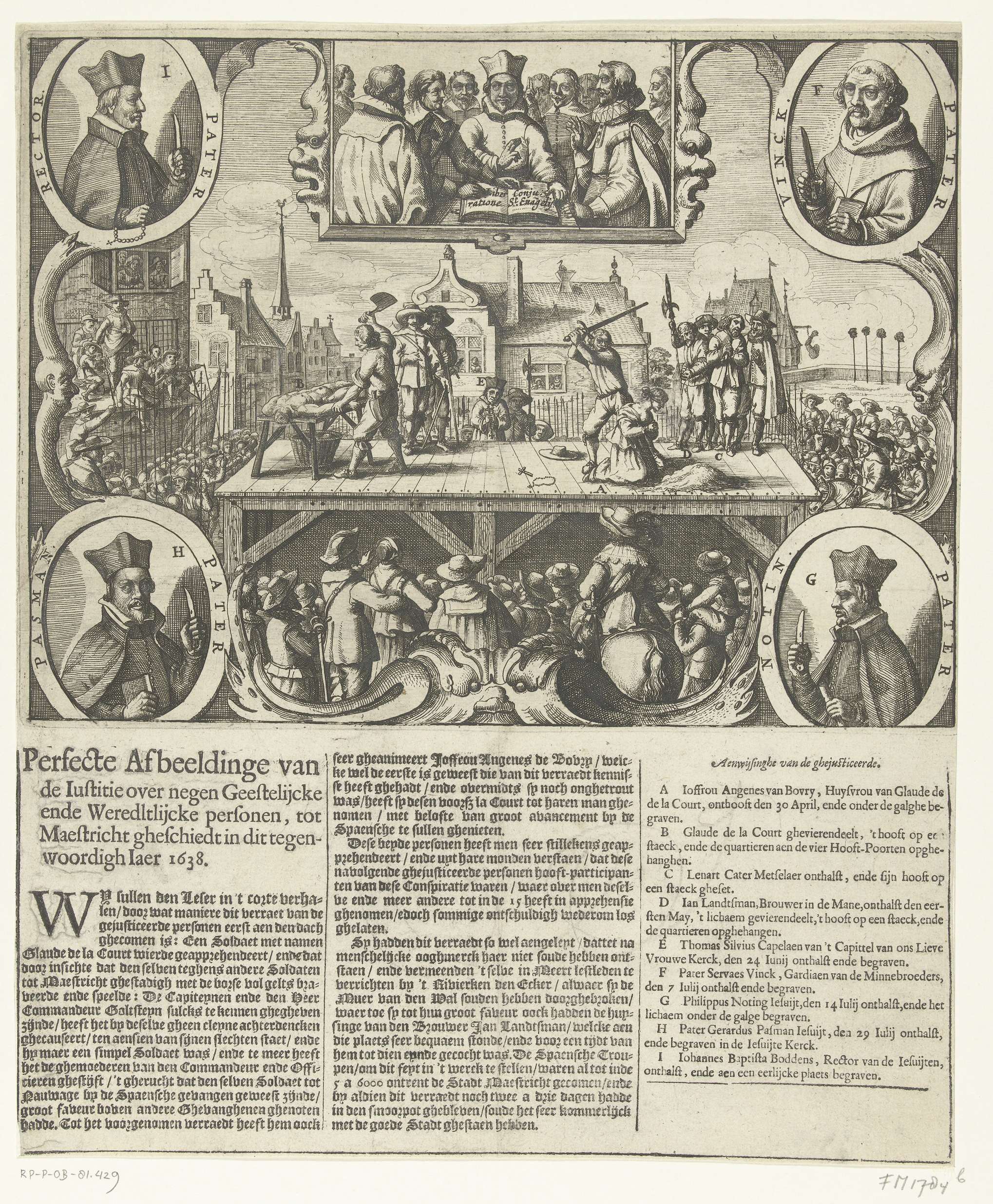 Executies te Maastricht van de negen personen die samenzwoeren om Maastricht aan de Spanjaarden te verraden, 1638. Op een schavot wordt Claude de la Court gevierendeeld en zijn vrouw Angenes van Bovry onthoofd op 30 april 1638. In de hoeken portretten van de vier Roomse geestelijken die bij het complot betrokken waren en in juli ...