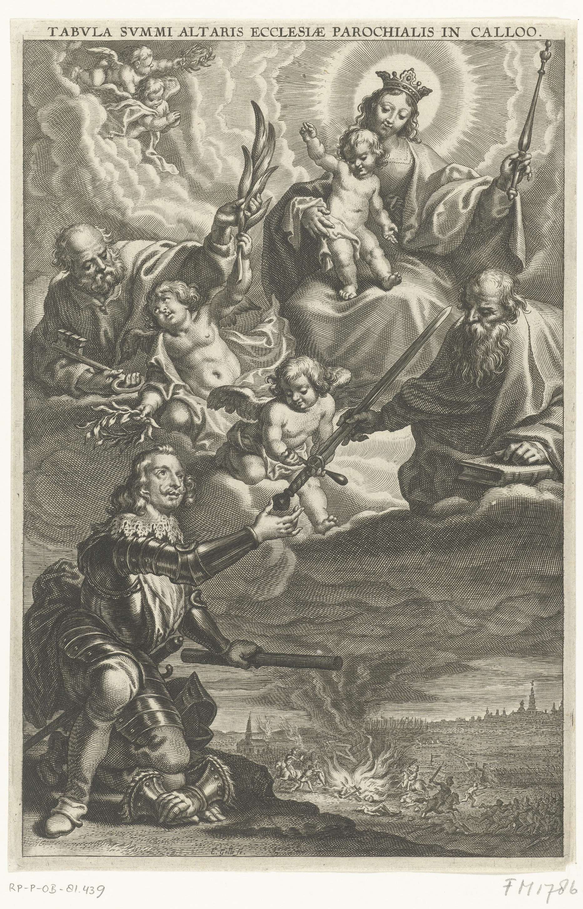 Ferdinand ontvangt het zwaard om de Staatsen bij Kallo te bestrijden, 1638. De kardinaal-infant ontvangt knielend het zwaard uit de handen van Paulus. In de hemel Maria met kind, Petrus en engelen. Op de achtergrond vluchtende soldaten van het Staatse leger onder graaf Willem van Nassau-Siegen na de mislukte aanval op de schans bij Kallo, ...