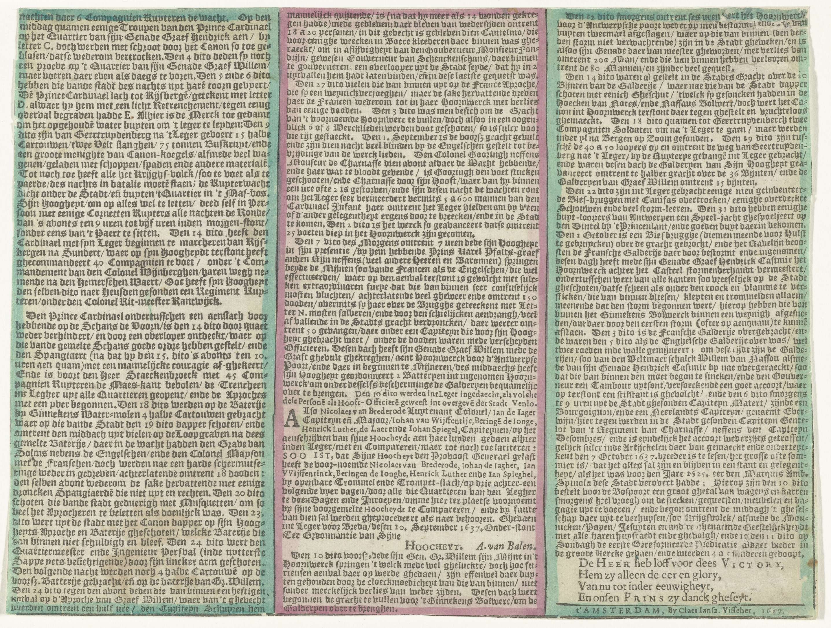 Tekstblad bij de kaart van de belegering van Breda door het Staatse leger onder Frederik Hendrick, 23 juli - 10 oktober 1637. Tekstblad (rechterhelft) met een beschrijving van de gebeurtenissen in 3 lange kolommen.