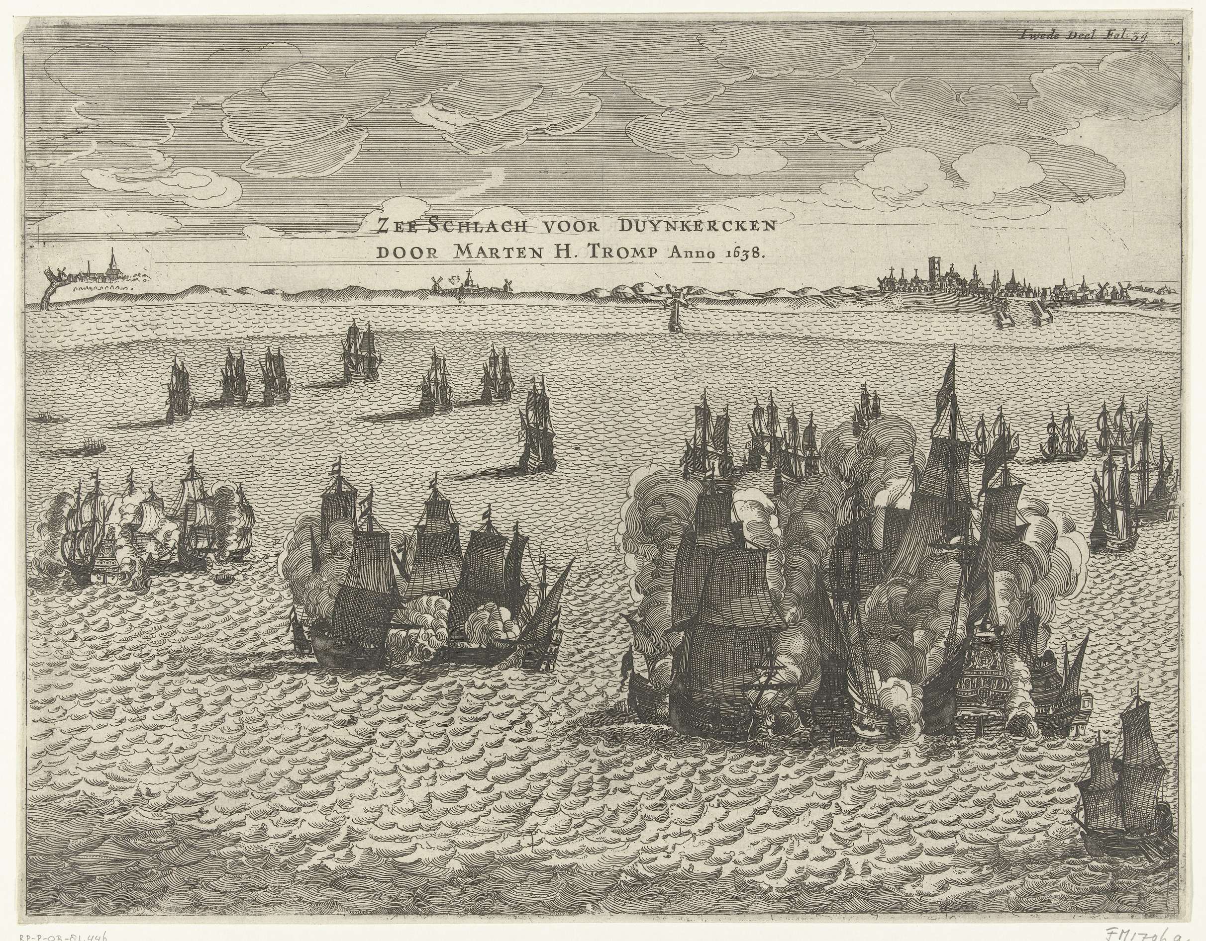 Zeeslag voor de kust bij Duinkerken, 18 februari 1639. Slag tussen de Staatse vloot onder Maarten Harpertszoon Tromp en een Spaanse vloot die de blokkade van de haven probeert te doorbreken. Gemerkt rechtsboven: Twede Deel Fol. 34.
