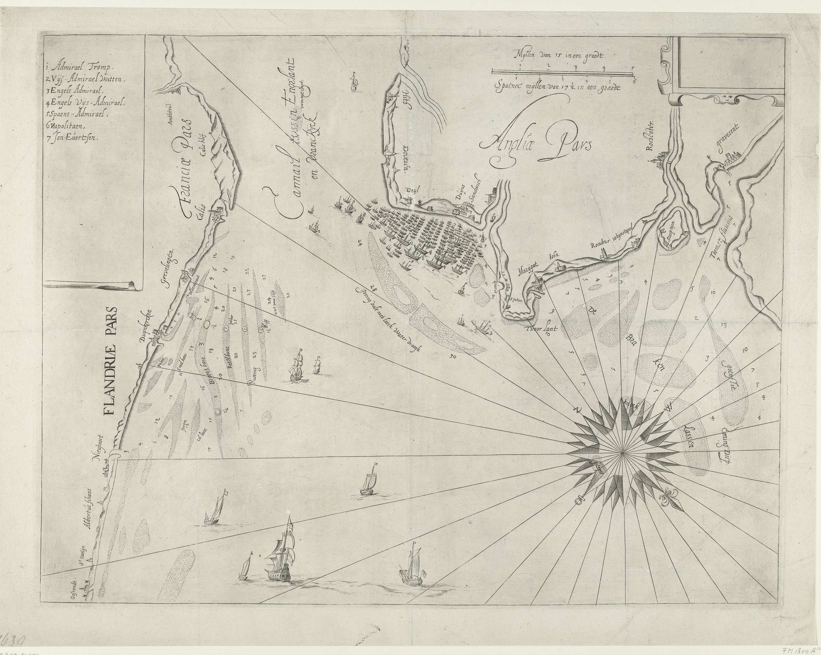 Zeekaart van de Engelse kust bij Duins, locatie van de zeeslag bij Duins tussen de Spaanse Armada, onder bevel van Antonio de Oquendo en de Staatse vloot onder Maarten Harpertsz. Tromp, 21 oktober 1639. Met de Spaanse vloot ingesloten door de Staatse vloot. Links de Vlaamse en Noord-Franse kust tussen Oostende en Calais, boven en ...