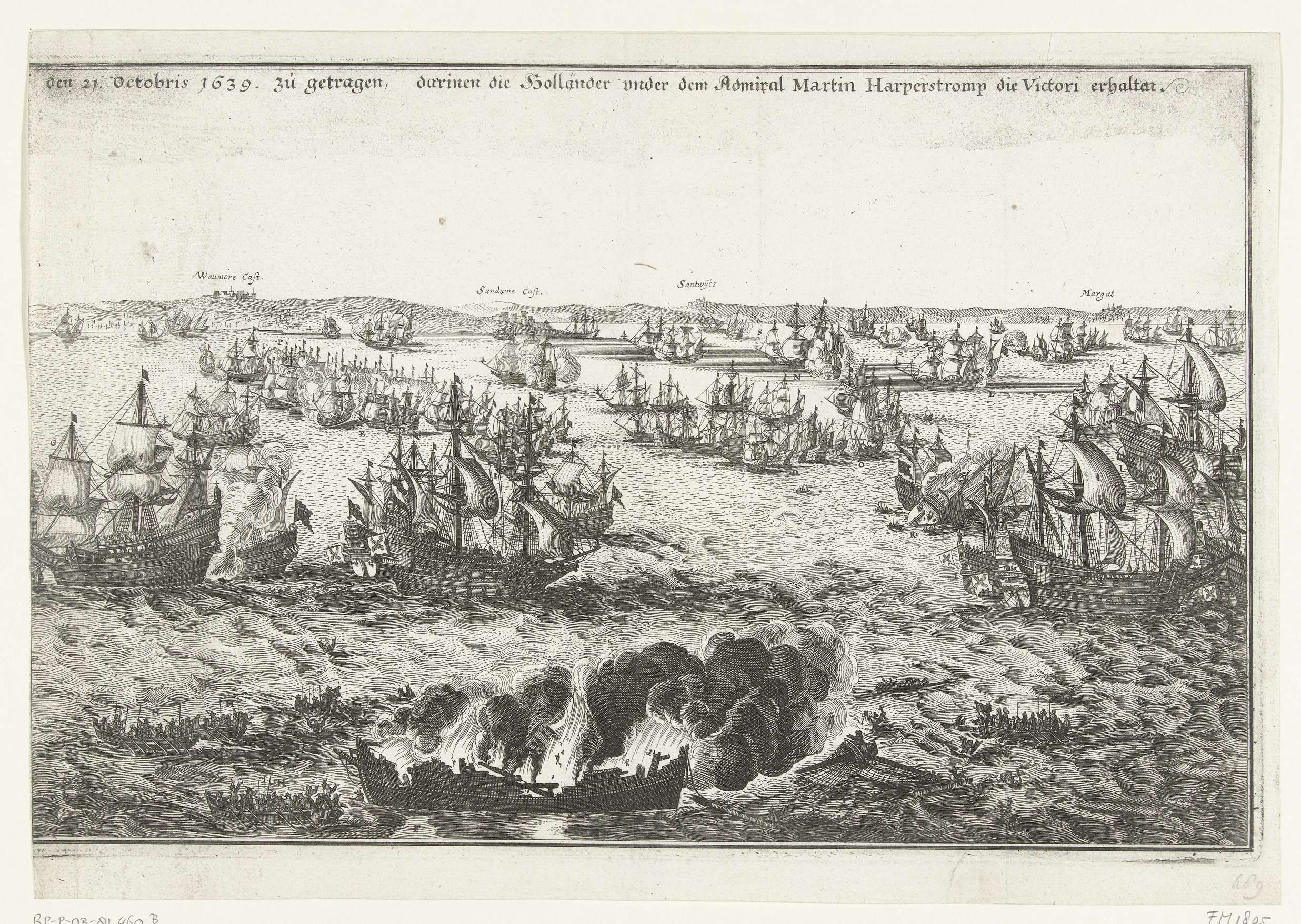 Zeeslag bij Duins tussen de Spaanse vloot onder bevel van Antonio de Oquendo en de Staatse vloot onder Maarten Harpertsz. Tromp, 21 oktober 1639. Rechterplaat met op de voorgrond een brandend schip en sloepen met bemanningsleden, rechts de veroverde Spaanse schepen. Op de achtergrond de Engelse kust tussen Walmer en Margate.