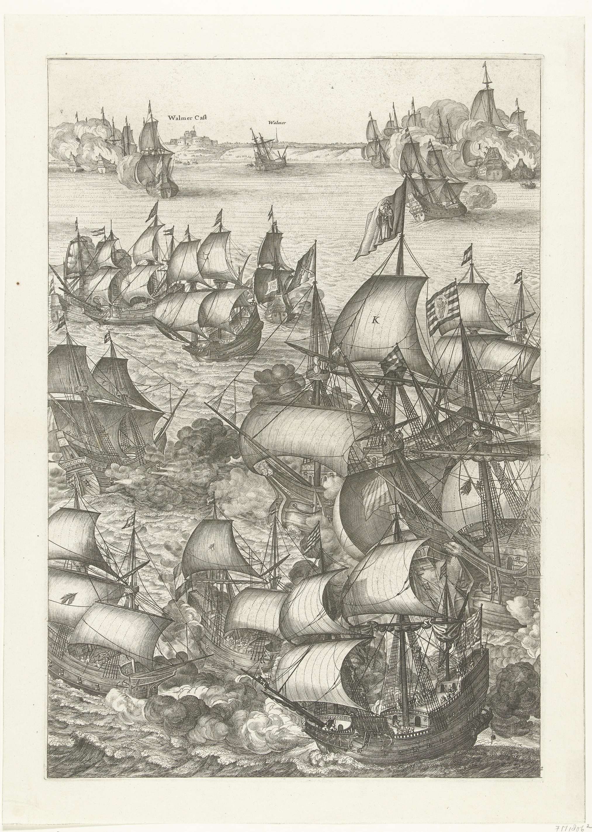 Grote voorstelling van de zeeslag bij Duins tussen de Spaanse vloot onder bevel van Antonio de Oquendo en de Staatse vloot onder Maarten Harpertsz. Tromp, 21 oktober 1639. Blad 2: gevechten op zee, op de achtergrond brandende schepen voor de kust bij Walmer. Ongemonteerde ensemble bestaande uit 7 genummerde platen, de zwarte stroken met de ...