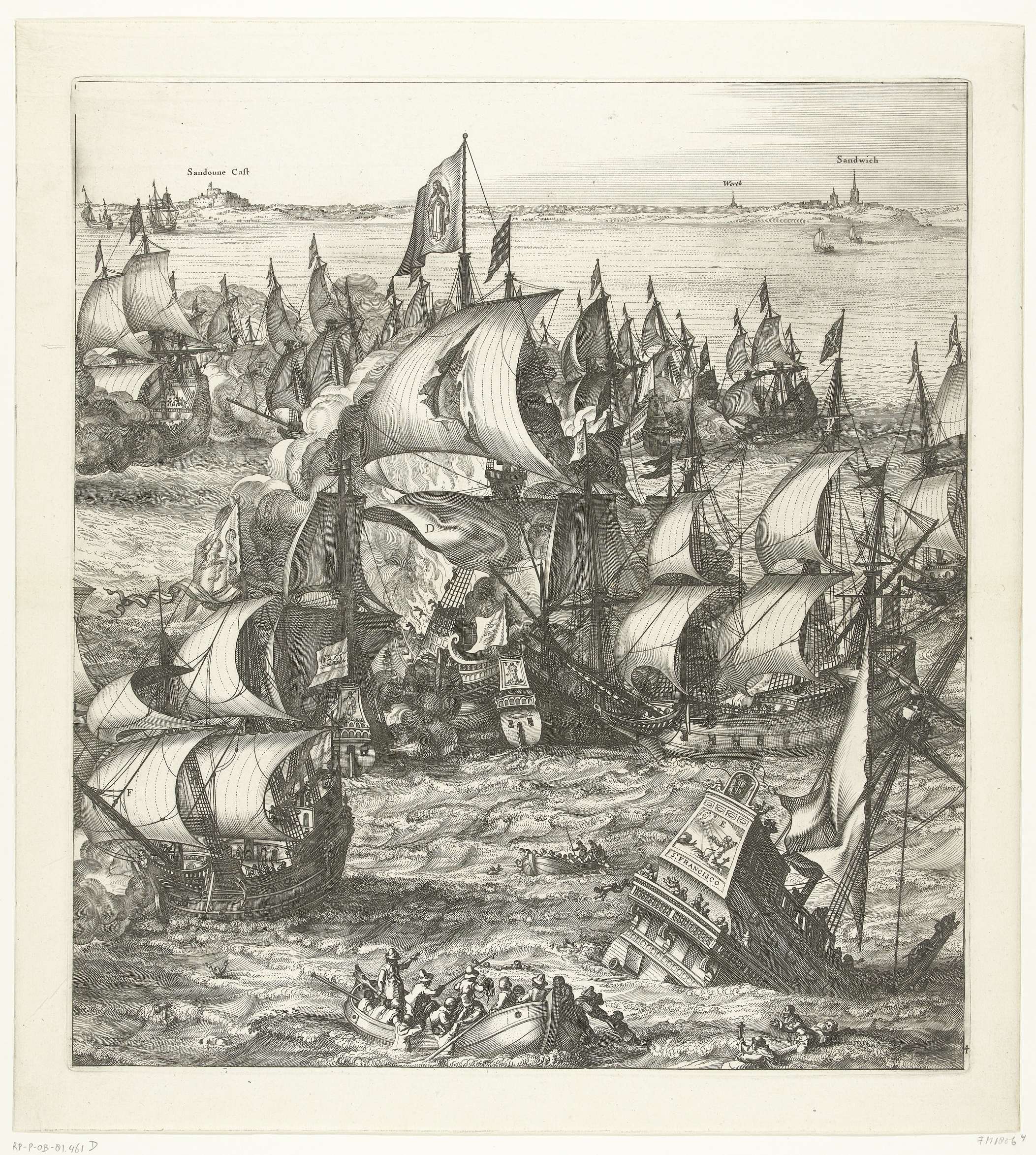 Grote voorstelling van de zeeslag bij Duins tussen de Spaanse vloot onder bevel van Antonio de Oquendo en de Staatse vloot onder Maarten Harpertsz. Tromp, 21 oktober 1639. Blad 4: gevechten op zee, centraal de verwoesting van de Santa Teresa, op de voorgrond worden bij de zinkende St. Francisco drenkelingen uit het water gehaald. Op ...