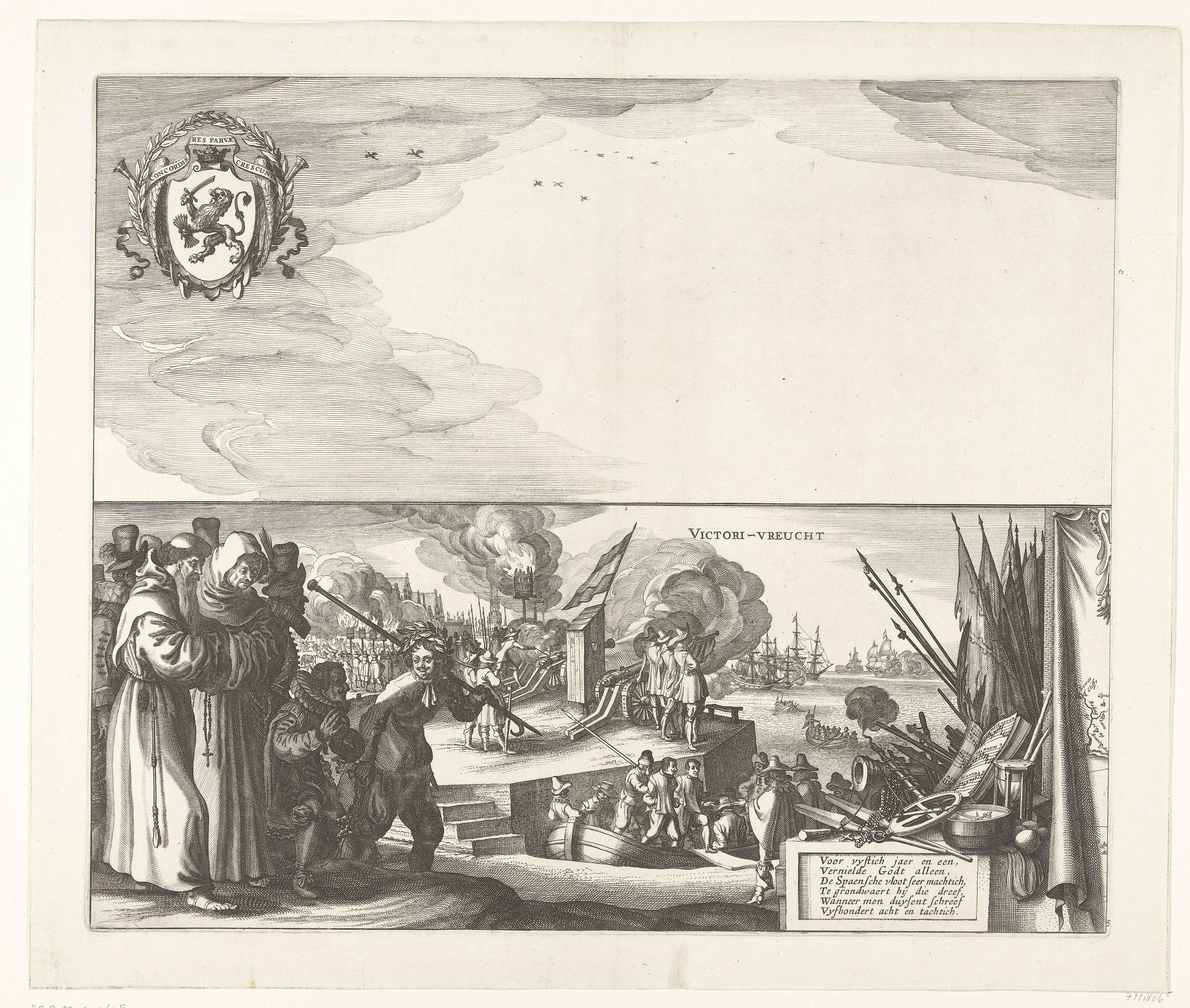 Grote voorstelling van de zeeslag bij Duins tussen de Spaanse vloot onder bevel van Antonio de Oquendo en de Staatse vloot onder Maarten Harpertsz. Tromp, 21 oktober 1639. Blad 5: voorstelling in tweeën gedeeld. Bovenaan de lucht met het wapen van de Generaliteit. Daaronder geketende gevangen Spanjaarden en monniken aan de wal, saluutschoten en vreugdevuren ...