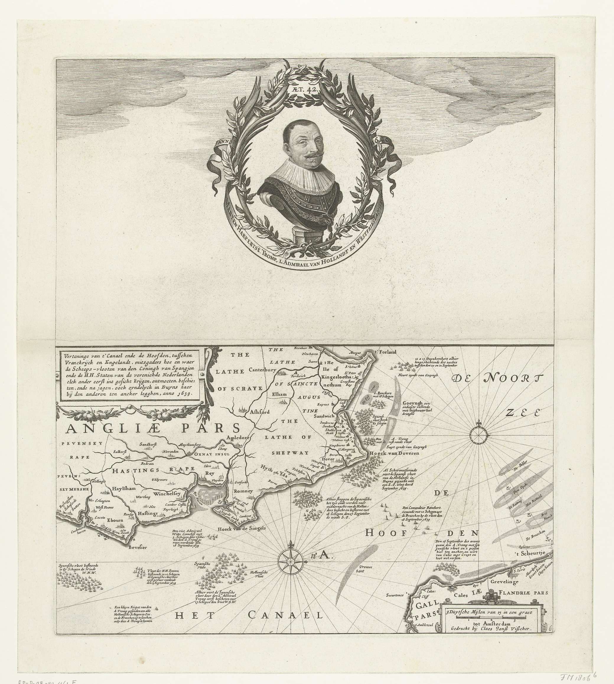 Grote voorstelling van de zeeslag bij Duins tussen de Spaanse vloot onder bevel van Antonio de Oquendo en de Staatse vloot onder Maarten Harpertsz. Tromp, 21 oktober 1639. Blad 6: voorstelling in tweeën gedeeld. Bovenaan een portret van Tromp in borstbeeld in lauwerkrans. Daaronder een kaart van het kanaal en de Engelse kust met de ...