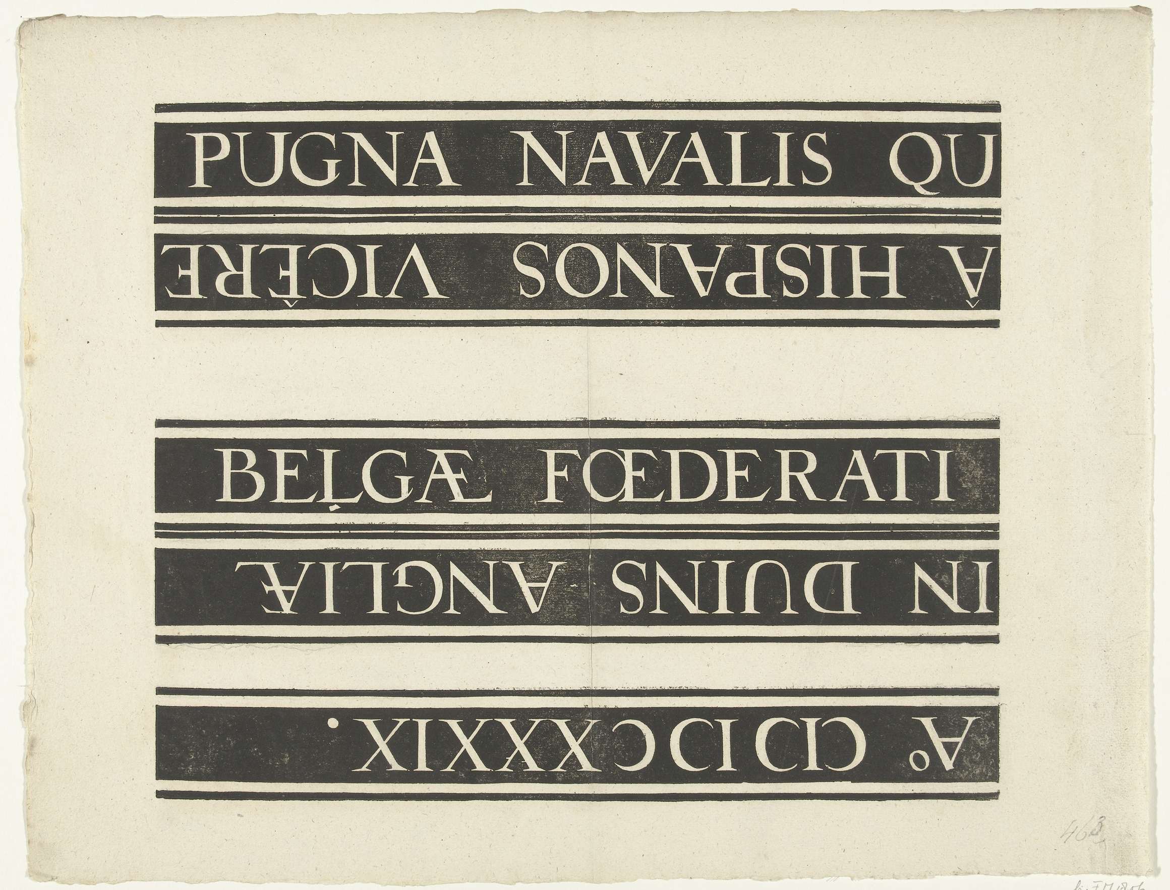 Grote voorstelling van de zeeslag bij Duins tussen de Spaanse vloot onder bevel van Antonio de Oquendo en de Staatse vloot onder Maarten Harpertsz. Tromp, 21 oktober 1639. Onversneden blad met de titel in 5 delen onder elkaar gedrukt. Ongemonteerde ensemble bestaande uit 7 genummerde platen, de zwarte stroken met de titel en tekstblad met ...