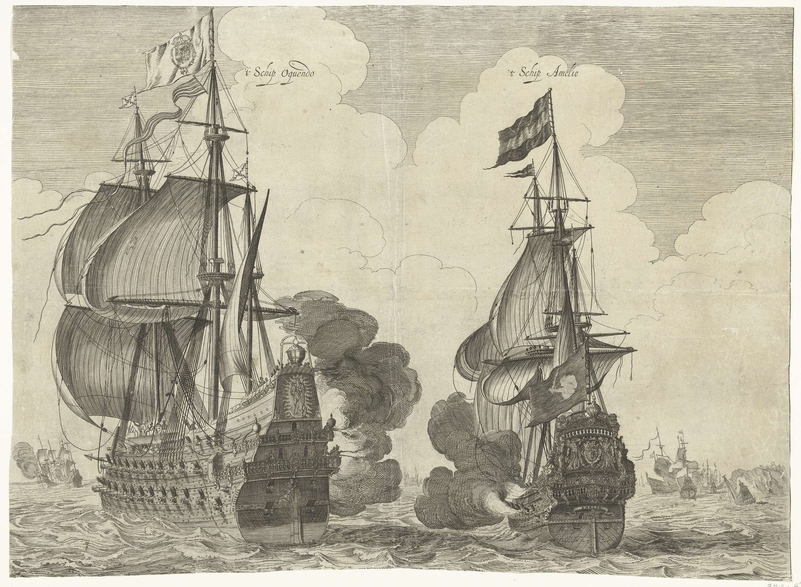 Gevecht tussen het Staatse admiraalsschip Aemelia van Maarten Tromp en het Spaanse admiraalsschip Santa Teresa van Antonio de Oquendo tijdens de slag bij Duins, 21 oktober 1639. De beide schepen (met naam aangeduid) vuren van korte afstand op elkaar.