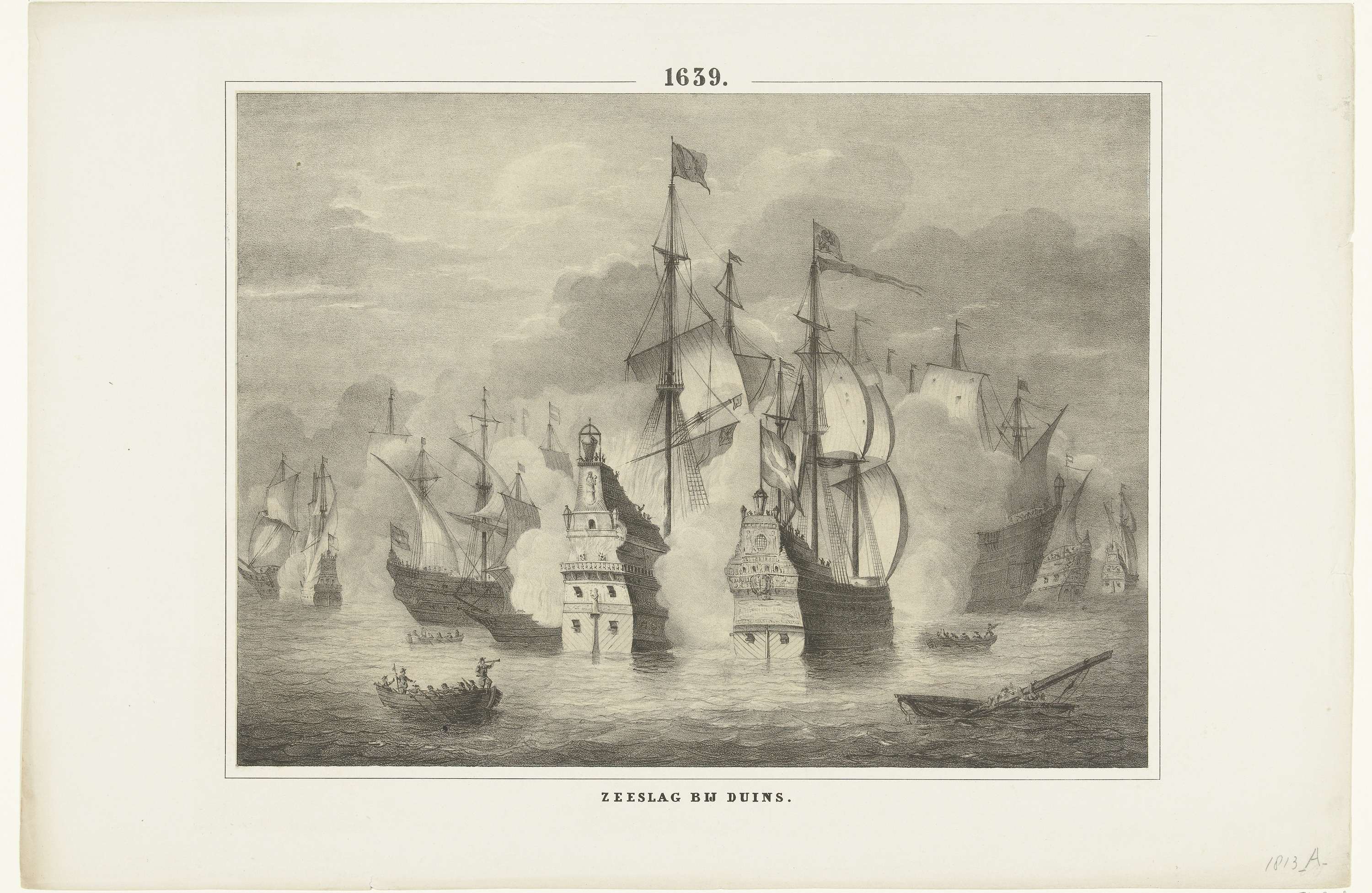 De overwinning op de Spaanse vloot tijdens de zeeslag bij Duins tussen de Spaanse vloot onder bevel van Antonio de Oquendo en de Staatse vloot onder Maarten Harpertsz. Tromp, 21 oktober 1639. Centraal het gevecht tussen de admiraalsschepen de Santa Teresa en de Aemilia.