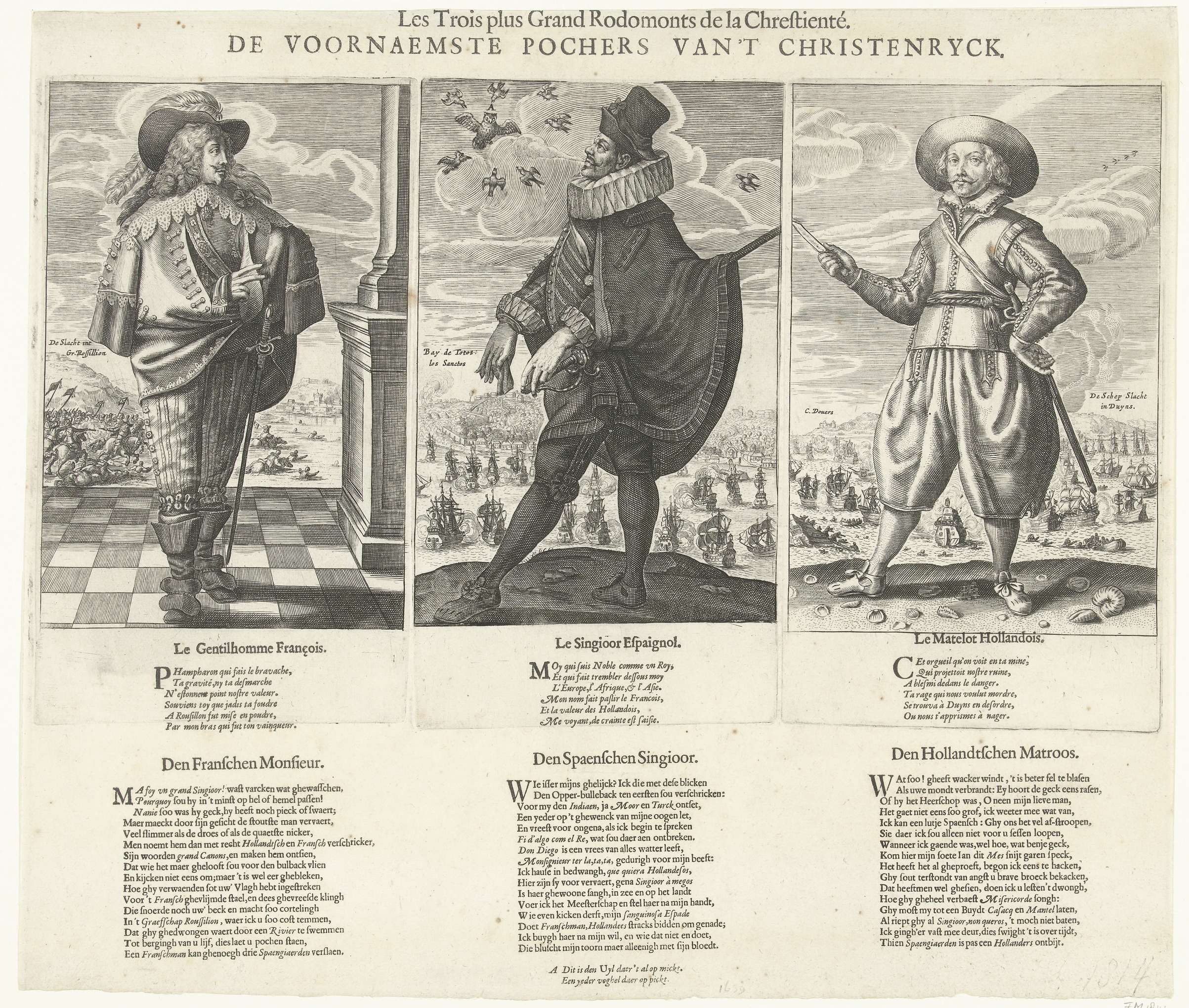 Spotprent op de Spanjaarden na de nederlaag in de zeeslag bij Duins, 21 oktober 1639. Blad waarop drie platen zijn afgedrukt. Centraal de Spanjaard (Den Spaenschen Singioor), links de Fransman (Den Franschen Monsieur) en rechts de Hollander (Den Hollandtschen Matroos). Achter de Spanjaard de verovering van San Salvador aan de Allerheiligenbaai in Brazilië op de ...