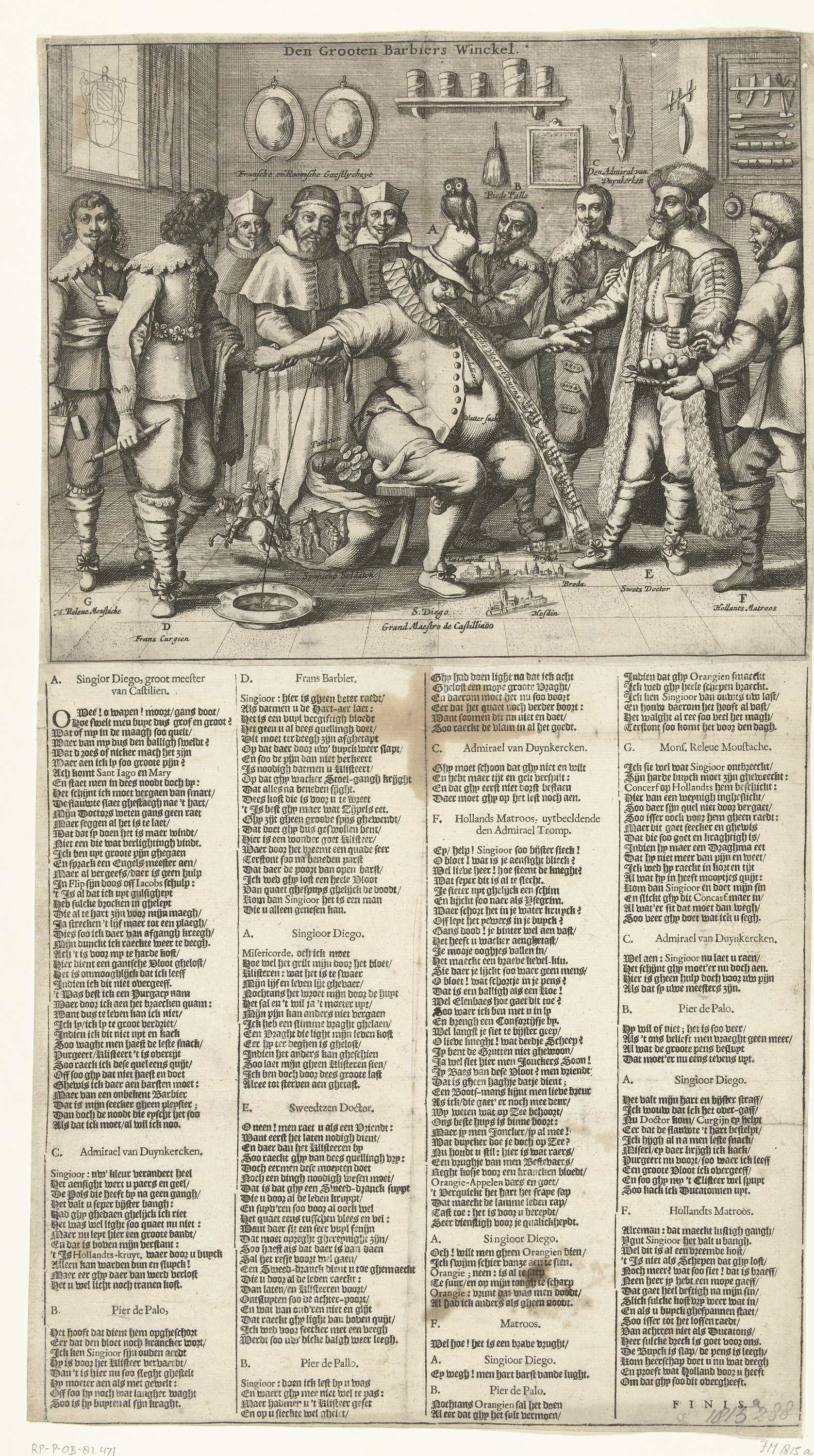 Spotprent op de Spanjaarden na de nederlaag in de zeeslag bij Duins, 21 oktober 1639. In een barbierswinkel zit met een uil op zijn hoofd een opgeblazen Spanjaard (Don Diego van Castilië) die lijdt aan waterzucht en wordt bijgestaan door een groep artsen. Hij spuugt de Spaanse vloot bij Duins uit, een Franse geneesheer (kardinaal ...
