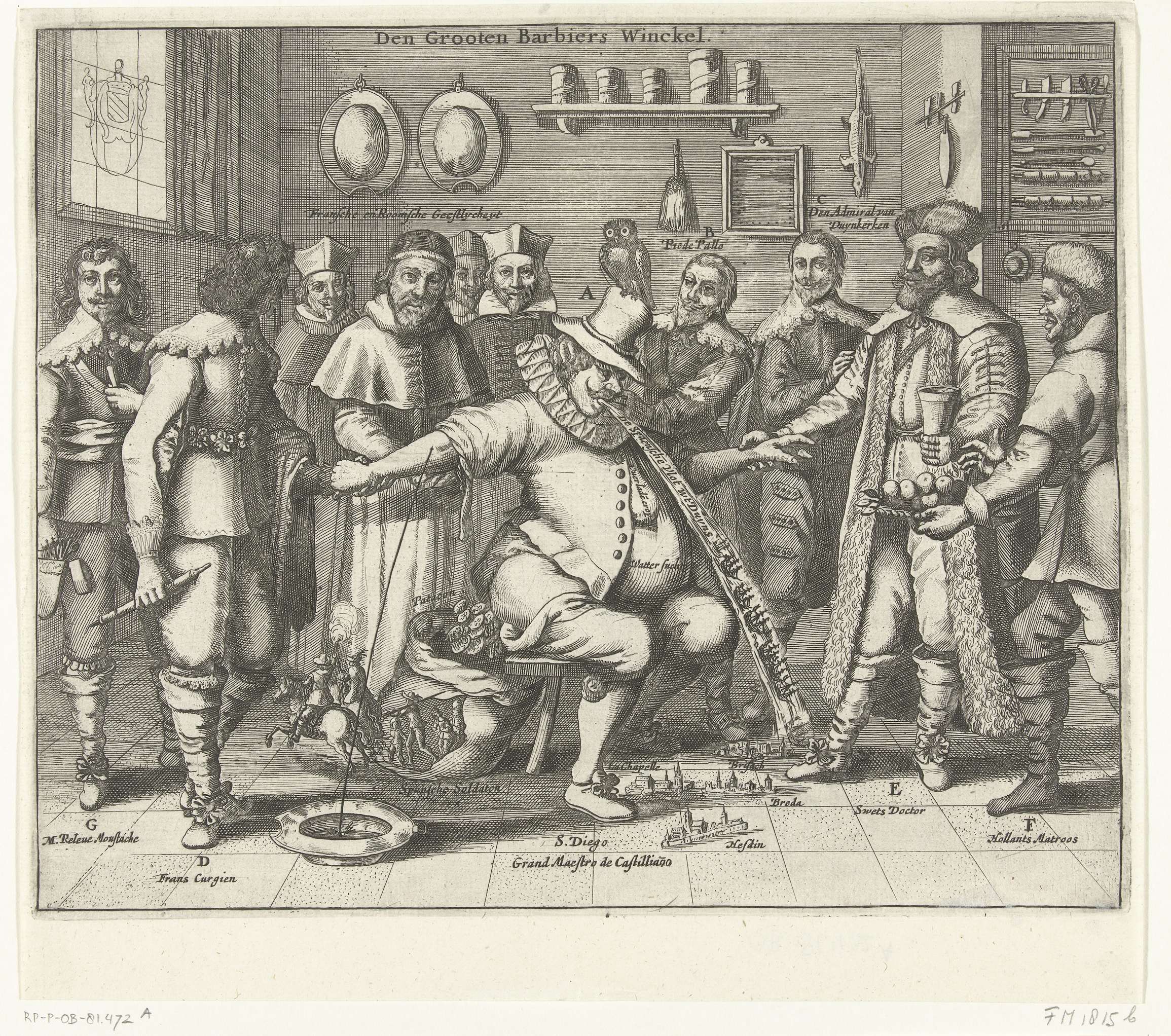 Spotprent op de Spanjaarden na de nederlaag in de zeeslag bij Duins, 21 oktober 1639. In een barbierswinkel zit met een uil op zijn hoofd een opgeblazen Spanjaard (Don Diego van Castilië) die lijdt aan waterzucht en wordt bijgestaan door een groep artsen. Hij spuugt de Spaanse vloot bij Duins uit, een Franse geneesheer (kardinaal ...