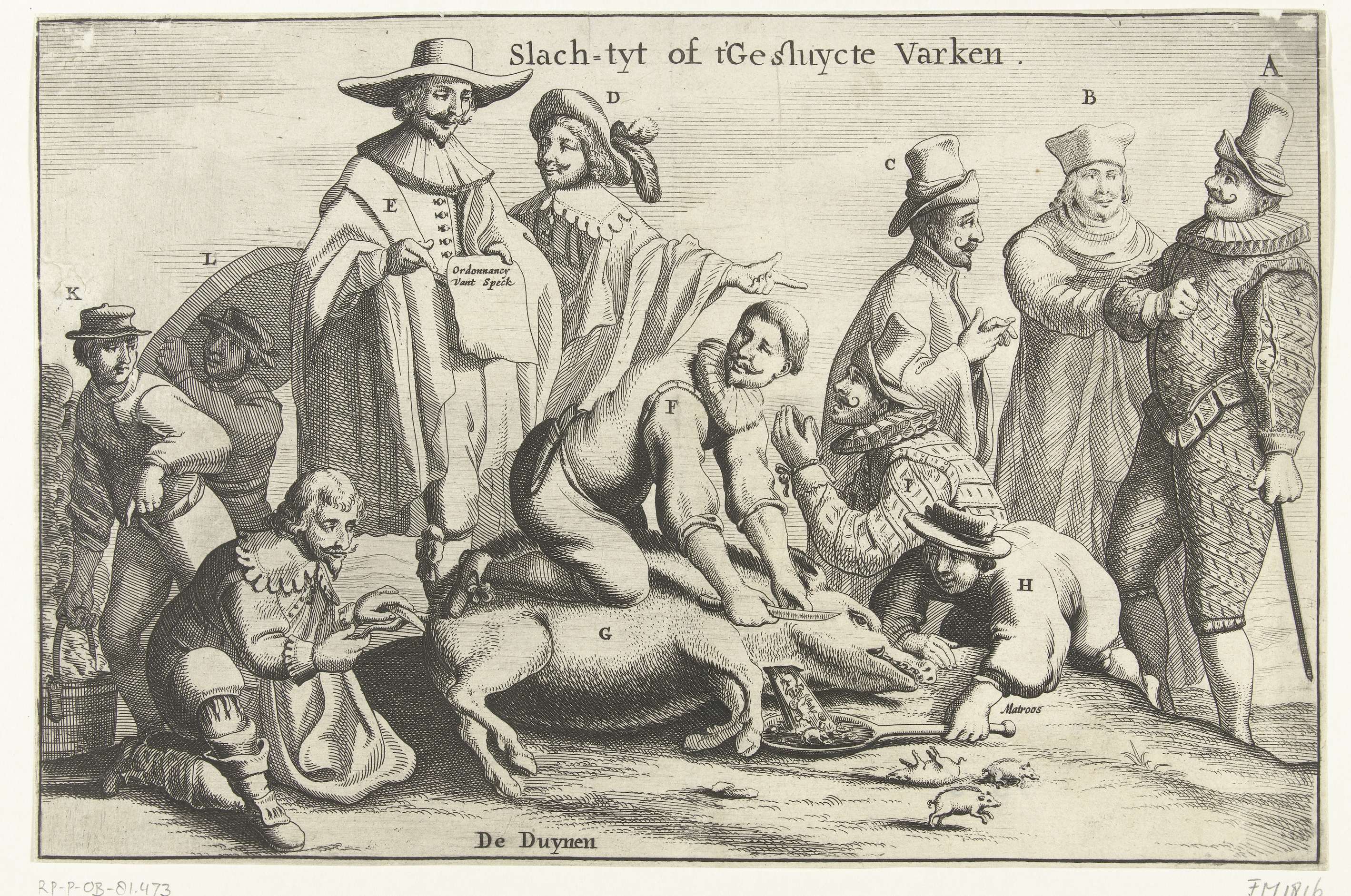 Spotprent op de Spanjaarden na de nederlaag in de zeeslag bij Duins, 21 oktober 1639. Maarten Tromp als de slager die een varken (Spanje) de keel heeft doorgesneden. De Hollandse Matroos vangt het bloed (biggen en goudstukken) op. Spanjaarden en andere omstanders kijken toe. Zonder de bijbehorende verklaring.
