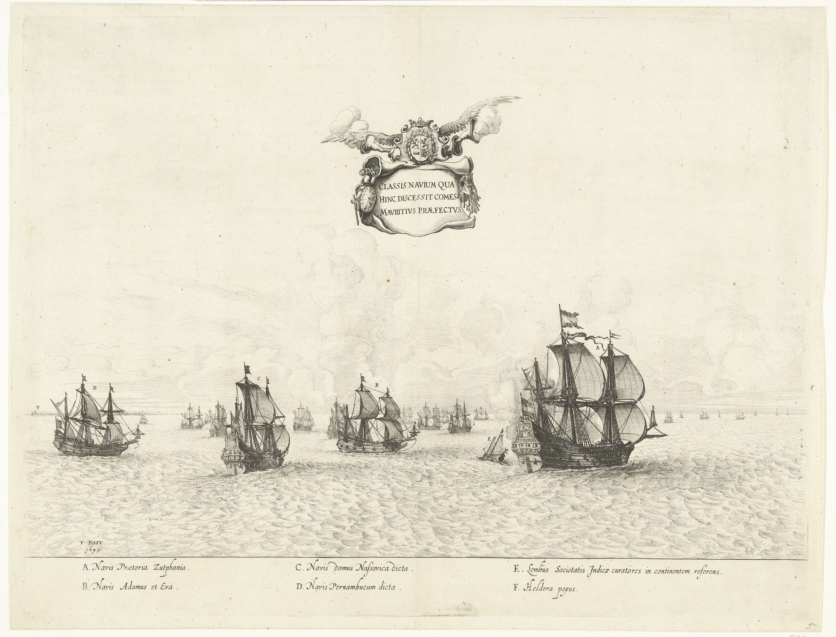 Het uitzeilen van de vloot van Johan Maurits, graaf van Nassau-Siegen, naar Brazilië, oktober 1636. De schepen op zee, links in de verte Den Helder. In de lucht een banderol met de titel en het gevleugelde wapen van Johan Maurits. In het onderschrift de verklaring van de letters A-F in het Latijn. Plaat [nr. 5] ...