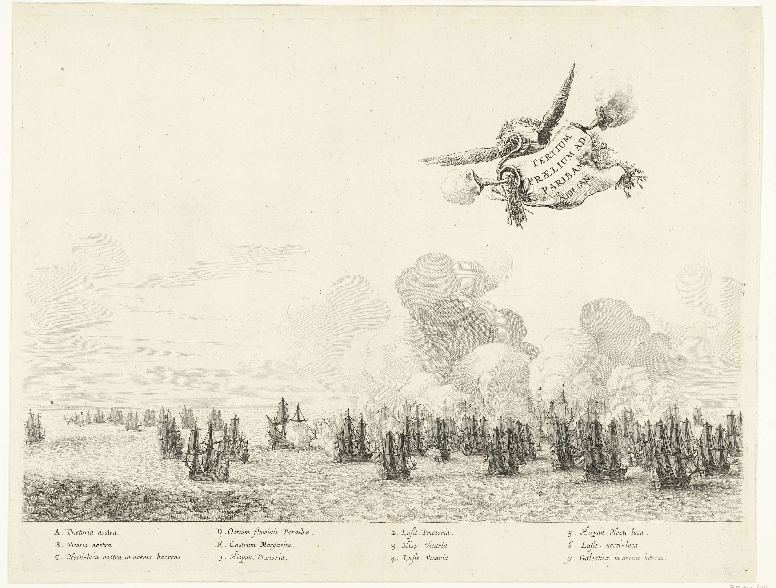 Derde gevecht tussen de vloot van de WIC onder Willem Cornelisz. Loos met de Portugese vloot onder graaf de la Torre voor de kust van Paraiba, 14 januari 1640. In de lucht een gevleugelde banderol met de titel en twee rookhoorns. In het onderschrift de verklaring van de letters A-E en de cijfers 1-7 in ...