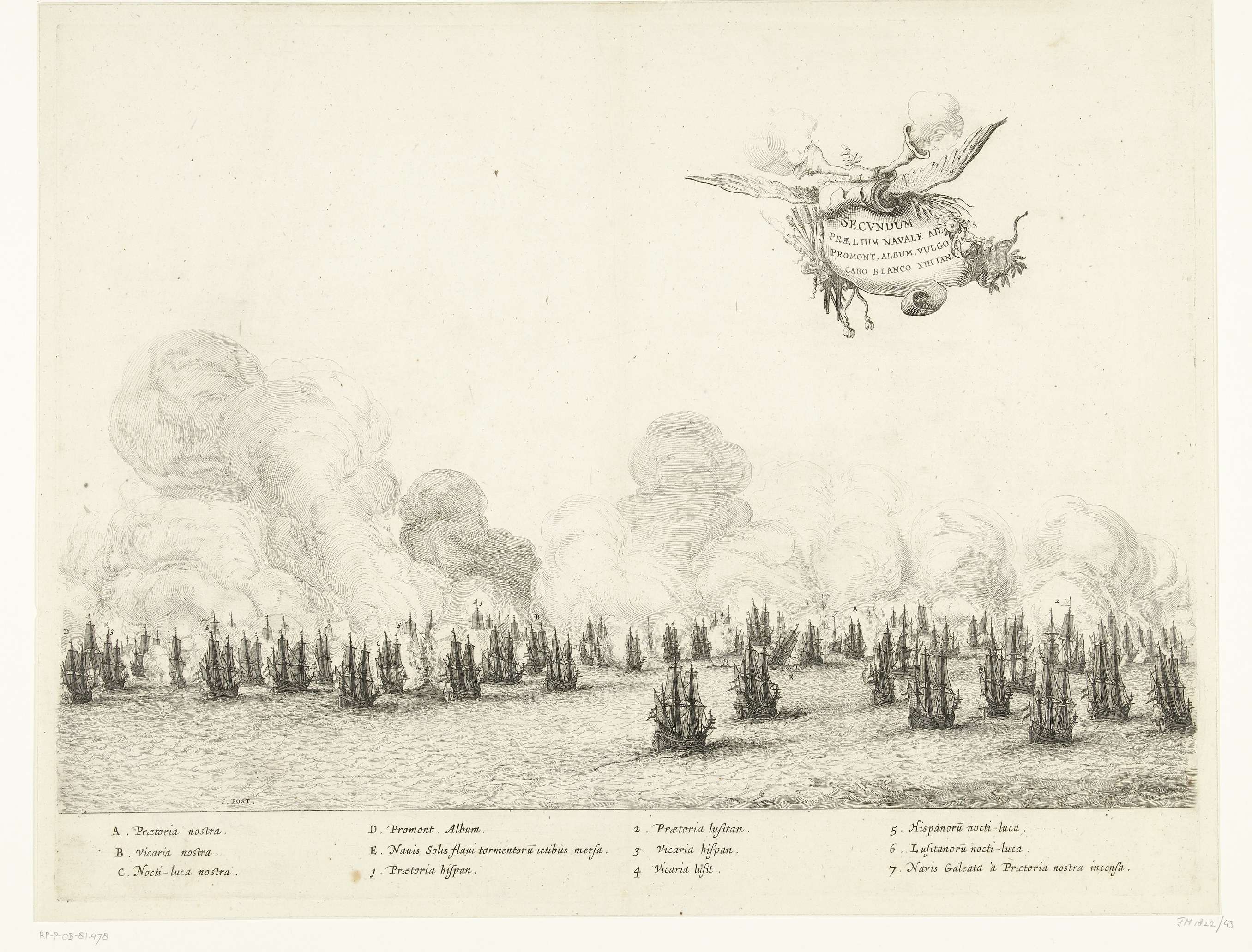 Tweede gevecht tussen de vloot van de WIC onder Willem Cornelisz. Loos met de Portugese vloot onder graaf de la Torre bij Cabo Blanco (Branco), voor de kust bij Salvador (Bahia), 13 januari 1640. In de lucht een gevleugelde banderol met de titel en twee rookhoorns. In het onderschrift de verklaring van de letters A-E ...